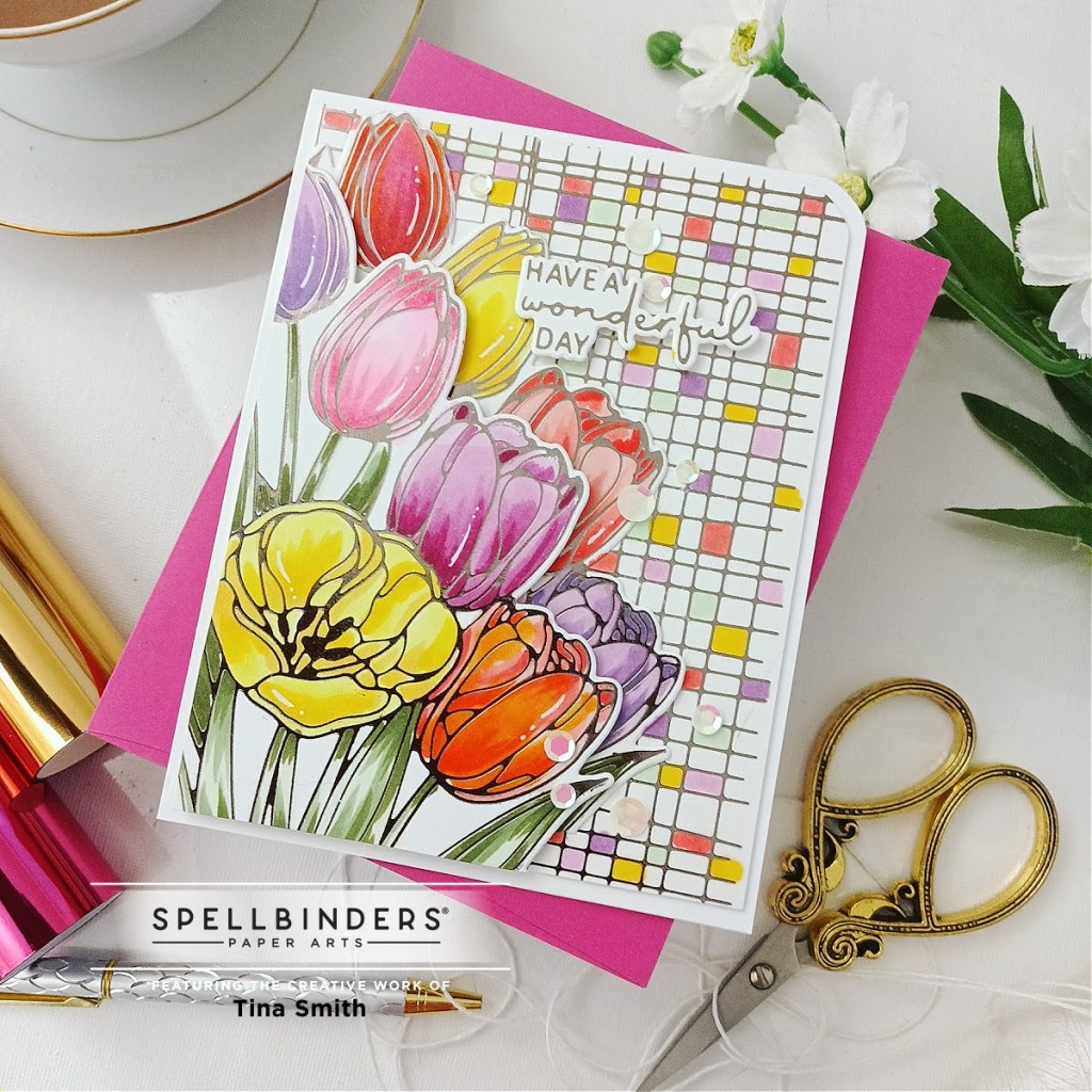 Hello Crafty Friends! Today I am sharing a card with a hot foil plate & die set that is super pretty and perfect for Spring! I am using a new item from the Spellbinders Four Petal Collection at the Spellbinders Shop. The Wonderful Tulips Glimmer Hot Foil Plate & Die Set has one large foil plate and a sentiment foil plate with 2 dies, one for the sentiment and one that cuts the outline of the tulips. I foiled with the beautiful Pewter Glimmer Foil Roll and used copic markers to color in my images. For my background I used the Woven Glimmer Hot Foil Plate and colored in a few of the squares with the same color markers that I used for my tulips. I love how this turned out and hope you do too!