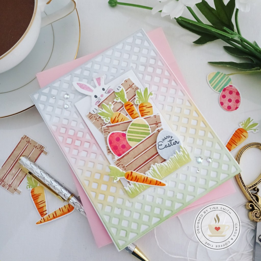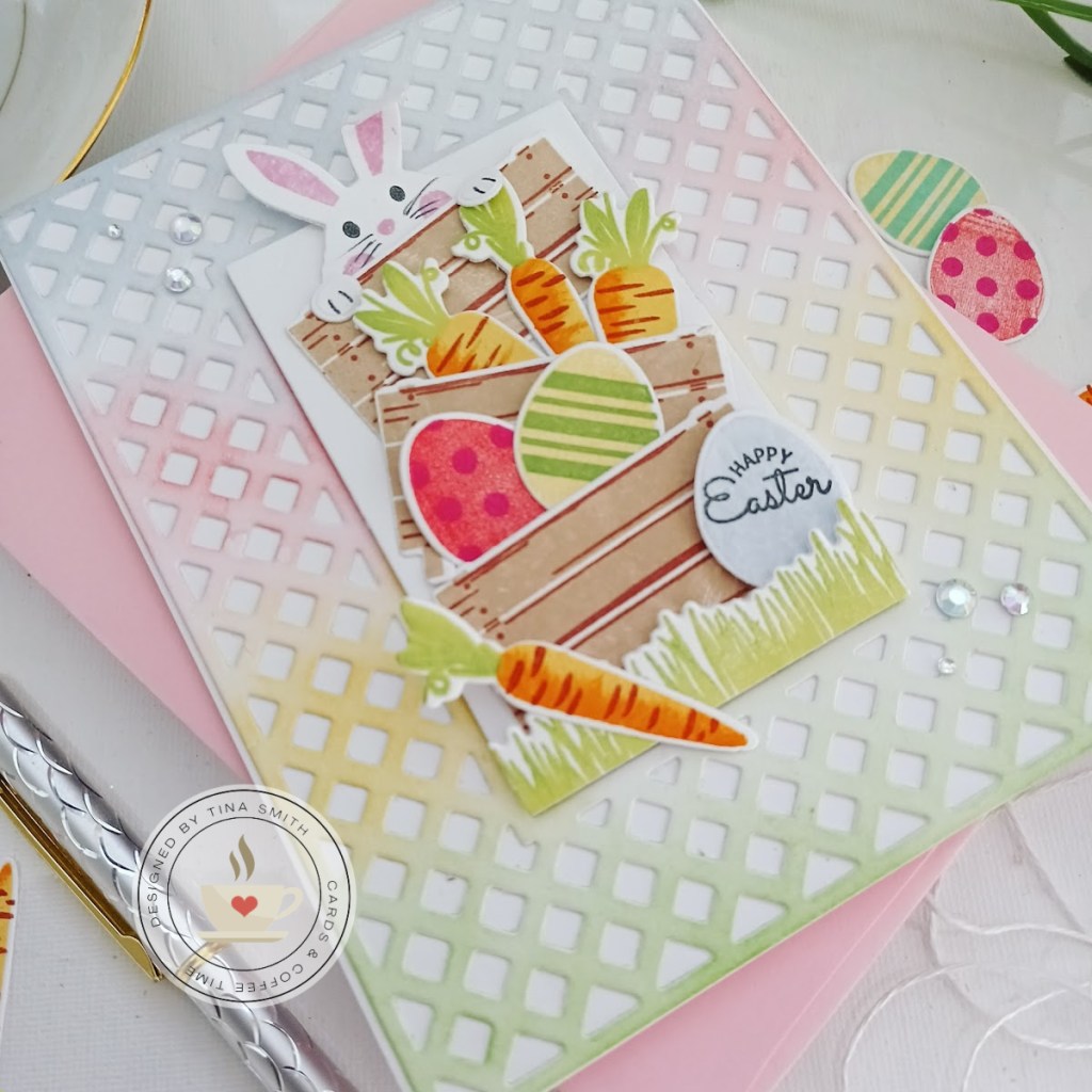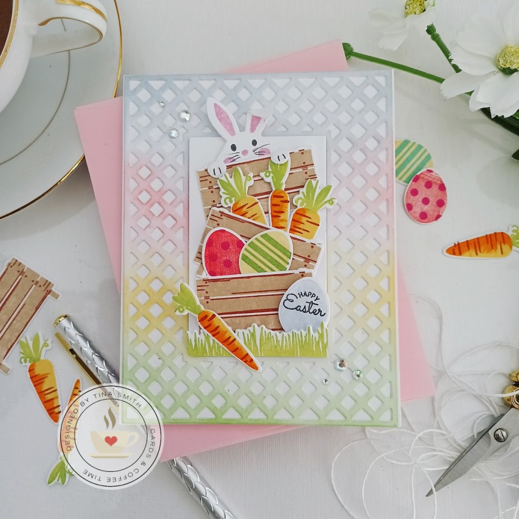 Hello crafty friends! Tina here, with a playful Easter card. For my project I used the On the Bunny Trail Stamp Set and Border Bling: Lattice Die. Both are from the Papertrey Ink Shop’s New February 2023 Release! I created a lattice background ink blending some soft Spring colors. I stamped 3 crates in the On the Bunny Trail stamp stacked them wonky and filled them with carrots, Easter eggs and topped them with a cute bunny peeking out. For finishing touches I added a few Rainbow Gems, so much fun! Check out the Papertrey Ink Shop and the latest Release Here!