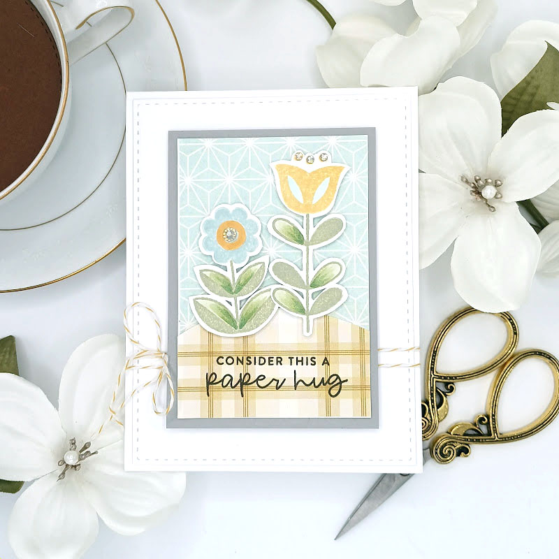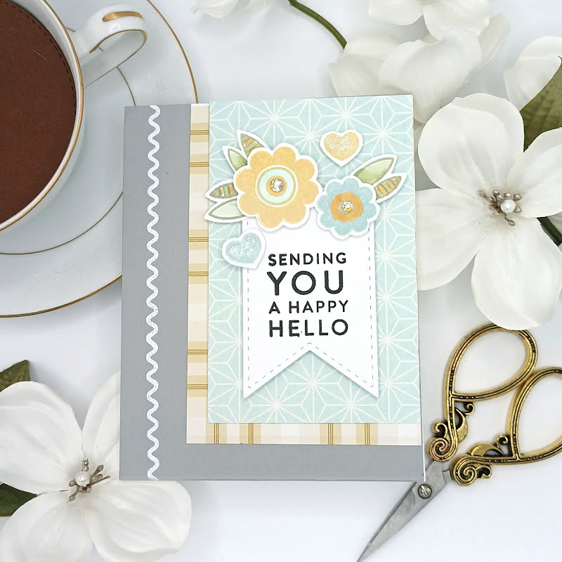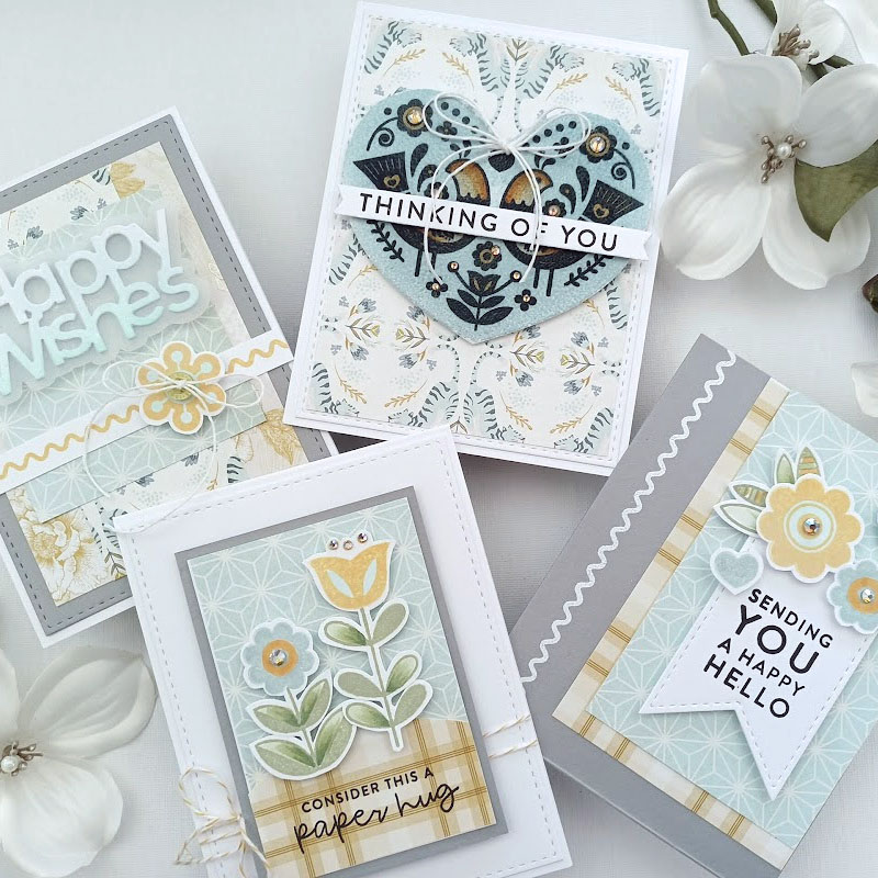 Hello Crafty Friends! I hope your having a great day! I am sharing 4 Spring themed projects with the Simon Says Stamp Happy Hello-March 2023 Card Kit. This month I love the “folk art” look of the stamp set and the patterned paper has beautiful soft tones and florals. The Happy Wishes Die is a fabulous stash builder too! I love creating a color theme with card kits, today I am using the yellows, greys and blues. I also used the Simon Says Stamp Bundle of Stitched Shapes for my cards and this this will be great to use for future card kit projects. Watch the how to video below for more details on how I created all four cards. I hope you like my projects!