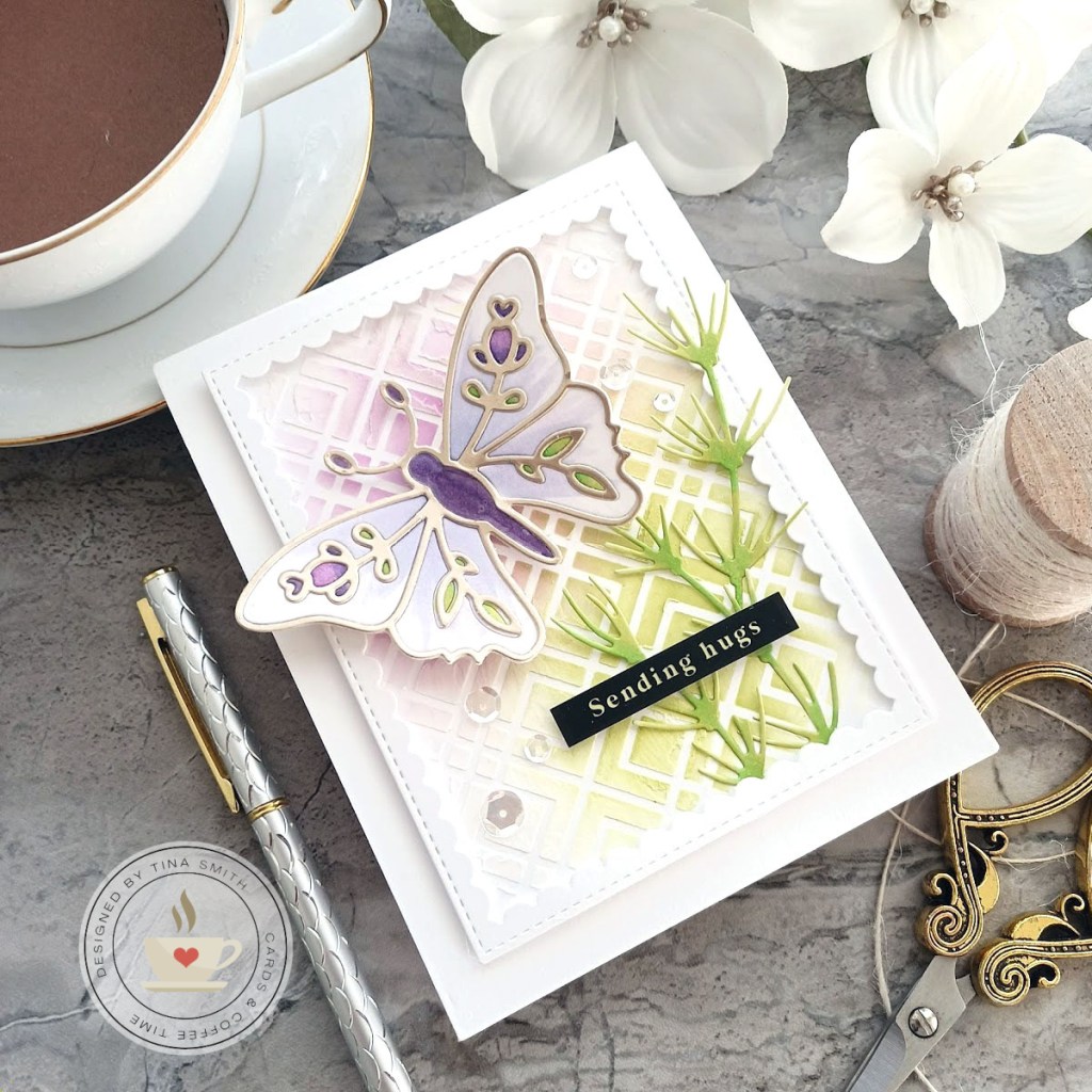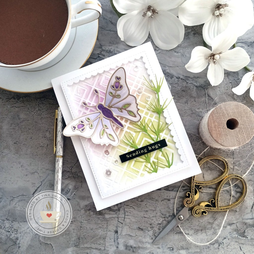 Hello Crafty Friends! I hope your having a great day! I am sharing a project with the Simon Says Stamp Rose Winged Wafer Die the new Everyday Acetate Sentiments. Both are part of the Simon Says Stamp BEAUTIFUL DAYS Release. I created an ink blended and texture pasted stenciled background with the Square Dance Stencil. I colored in the butterfly with my copic markers and paper pieced them in a Champagne Matte butterfly outline, for more details watch the tutorial below:) I hope you like my projects!