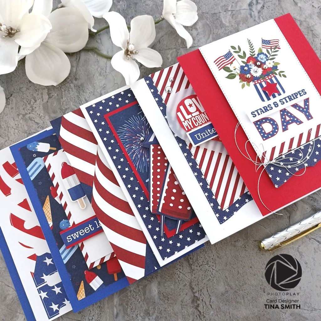 Hello crafty friends! Oh, say can you see…. a whole bunch of cards with the amazing Photoplay Paper Land That I Love 12×12 collection Pack. Great for Veterans, Independence Day and for thanking someone for their service! These cards are super quick with the collection because everything is coordinated for you! Watch how I made them in the step-by-step tutorial down below. I hope you like my projects!