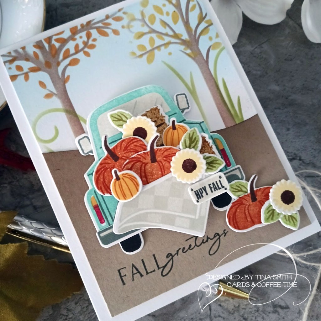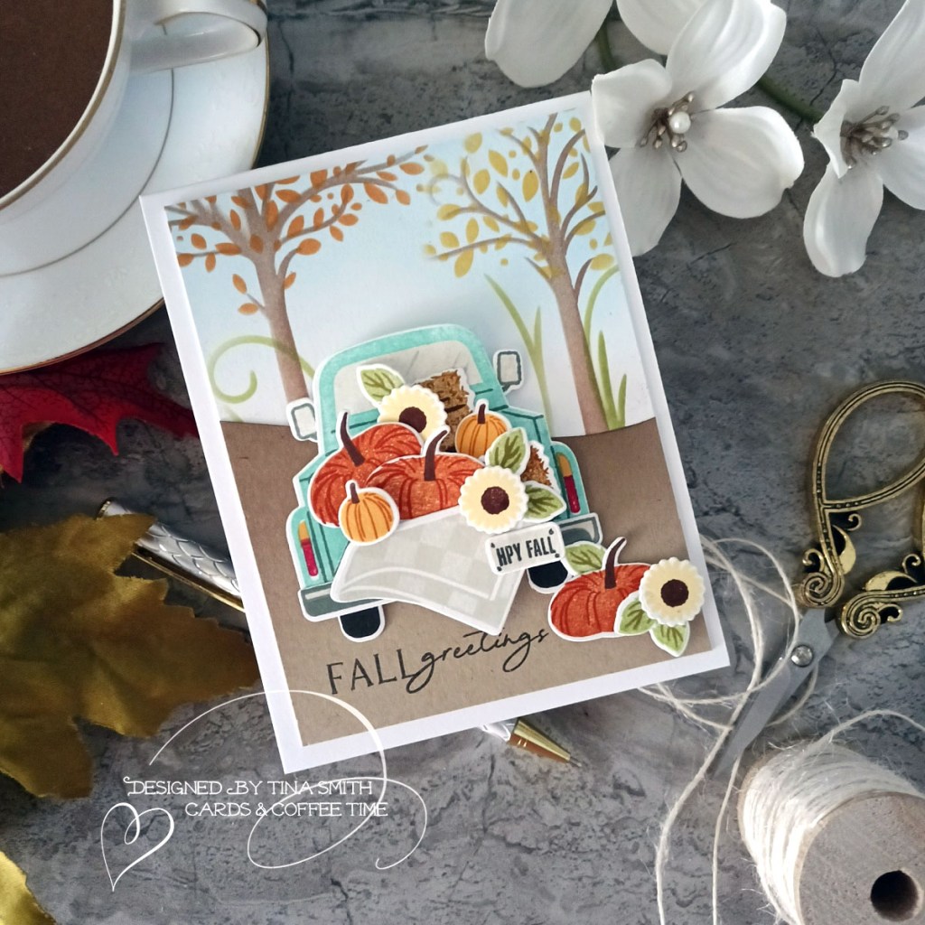 Hello crafty friends! Sending all the Fall vibes your way with this truckload of pumpkin goodness. @PapertreyInk has done it again with the AMAZING Farm Fresh Pumpkins Stamp set, it’s NEW and so much fun! Get ready to embrace cozy evenings, sweater weather, and carving traditions. To create it, I stenciled the background with the Delicate Trees Stencil Collection, I love this stencil, the inks I used are below.