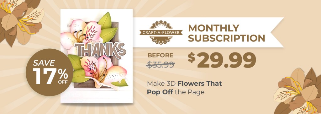 This is a monthly subscription plan for the Craft-A-Flower die set. When signed up, you are guaranteed a spot in our monthly Craft-A-Flower releases and will receive a set each month – at a specially discounted price! ( A 17% Savings )