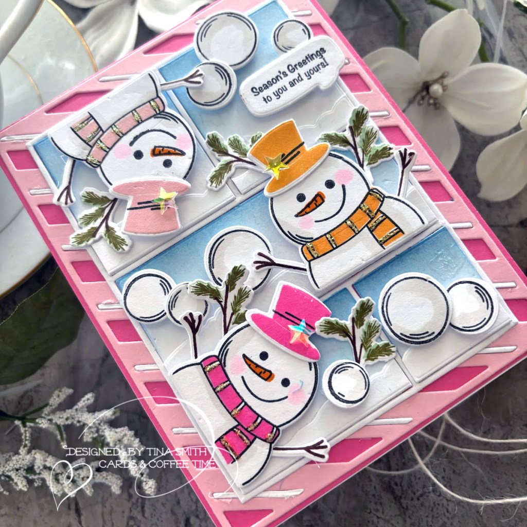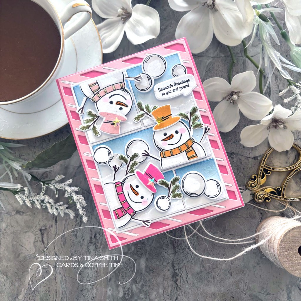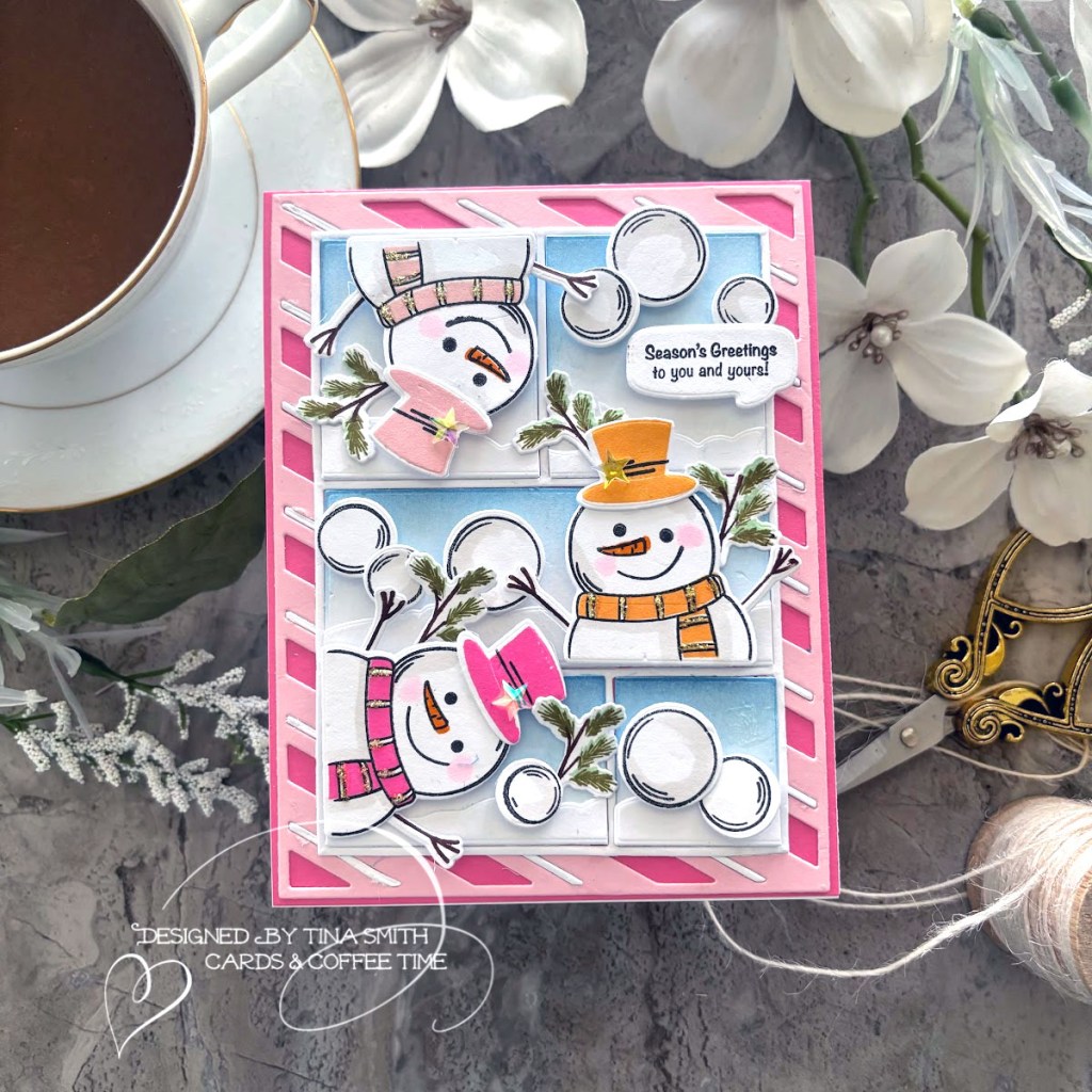 Hello crafty friends! I hope your day is going fabulous! Bundle up and get ready for some frosty snowman fun with the @PapertreyInk Christmas In Frames Stamp! It’s new part of the Fabulous October Release! Let the snowy shenanigans begin! Check out the Papertrey Ink Shop and the latest Release Here! I created a background with Hibiscus Burst, Pale Peony and White cardstock using the Border Bling: Candy Cane Frame 1 Die Set. I ink blended Blueberry Sky on the inside of the window panels I cut out with the Christmas In Frames Die set, adding snow banks to all five.