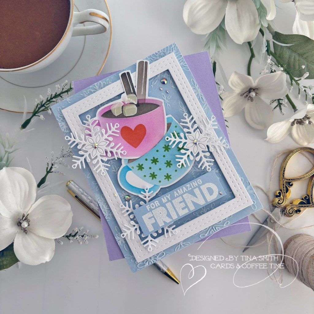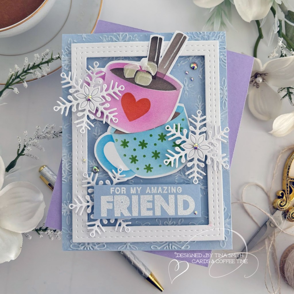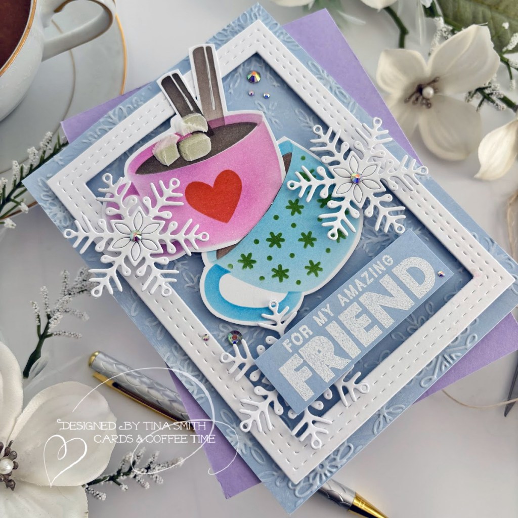 I used texture paste for the marshmallows. I stamped my greeting from the SSS Friend Greetings Stamp set and heat embossed it with white embossing powder. I finished my card by added more snowflakes using the SSS Rina Snowflake Die and a few Spellbinders Spectrum AB Gems. Have a Fabulous day! Hugs, Tina