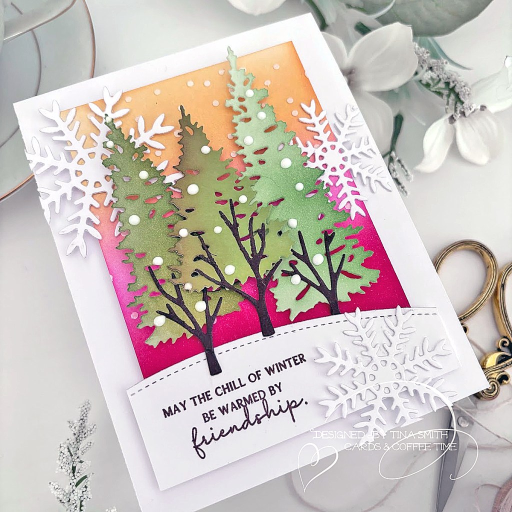Hello crafty friends! I hope your day is less chilly & more warm & cozy! Send warm friendship wishes this chilly winter season with the Into the Blooms: Evergreens Die Set from @PapertreyInk. This Winter Friendship card is sure to create smiles! Check out the Papertrey Ink Shop and the latest Release Here! I created my background using bright warm colors of ink, Hibiscus Burst, Pure Poppy and Summer Sunrise. I created a snow fall background with the snowfall stencil in the Winter Magic Stencil Collection using Texture Paste.