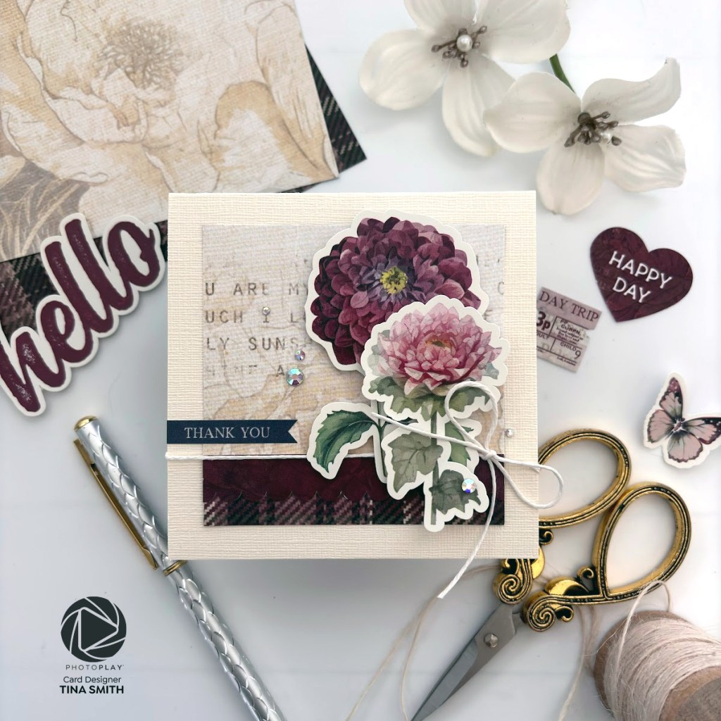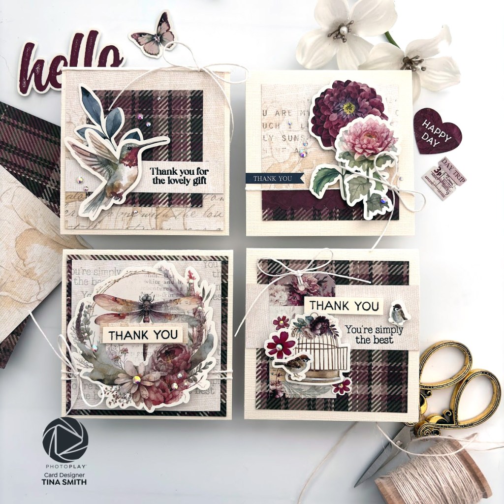 Hello crafty friends! Need a few Thank You cards? Playing with patterned paper today using the @PhotoplayPaper 12×12 Midnight Garden Collection Pack. Send some beautiful Thank You thoughts with this super pretty collection:) These cards are super quick to create with beautiful layers of paper, ephemera and sentiments from the SIS Inside Out Thank You Clear Stamp set. I also added white twine for texture & to keep the style soft. Watch the How-to tutorial below, I hope you like my project!