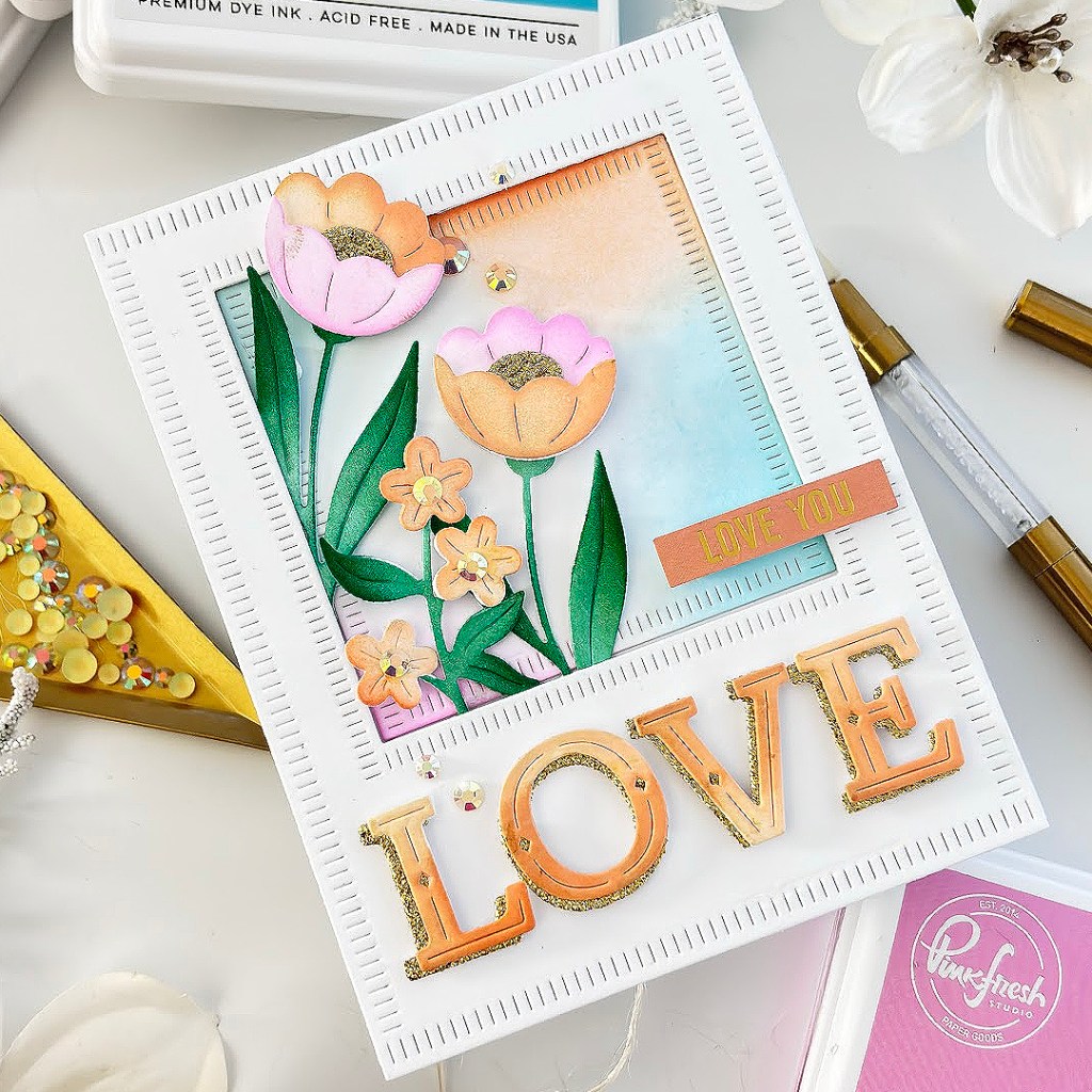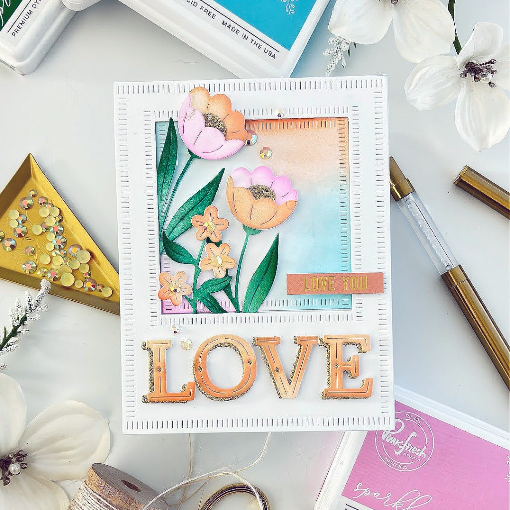I created a window using the Blanket Stitched Rectangle and Square Die sets. I ink blended colors on the inside square. I created lots of flowers using the Sweet Blossoms Die and Stencil using the inks listed below and placed a few of them in the corner of my window. I added sparkly detail with gold glitter cardstock and Peach Fuzz Gems. For my custom greeting, I die cut the letters that spell LOVE with the Julieta Alpha Die Set twice, one for ink blending with Sunkissed Ink and the other for offsetting with glitter cardstock. I also added the I Love You sticker in the Best Wishes Cardstock Sticker Set. I love how this turned out and hope you get a chance to participate in this month’s Challenge and Giveaway. Grab your coffee friends and let’s get to crafting! Wishing you a beautiful day! Hugs, Tina