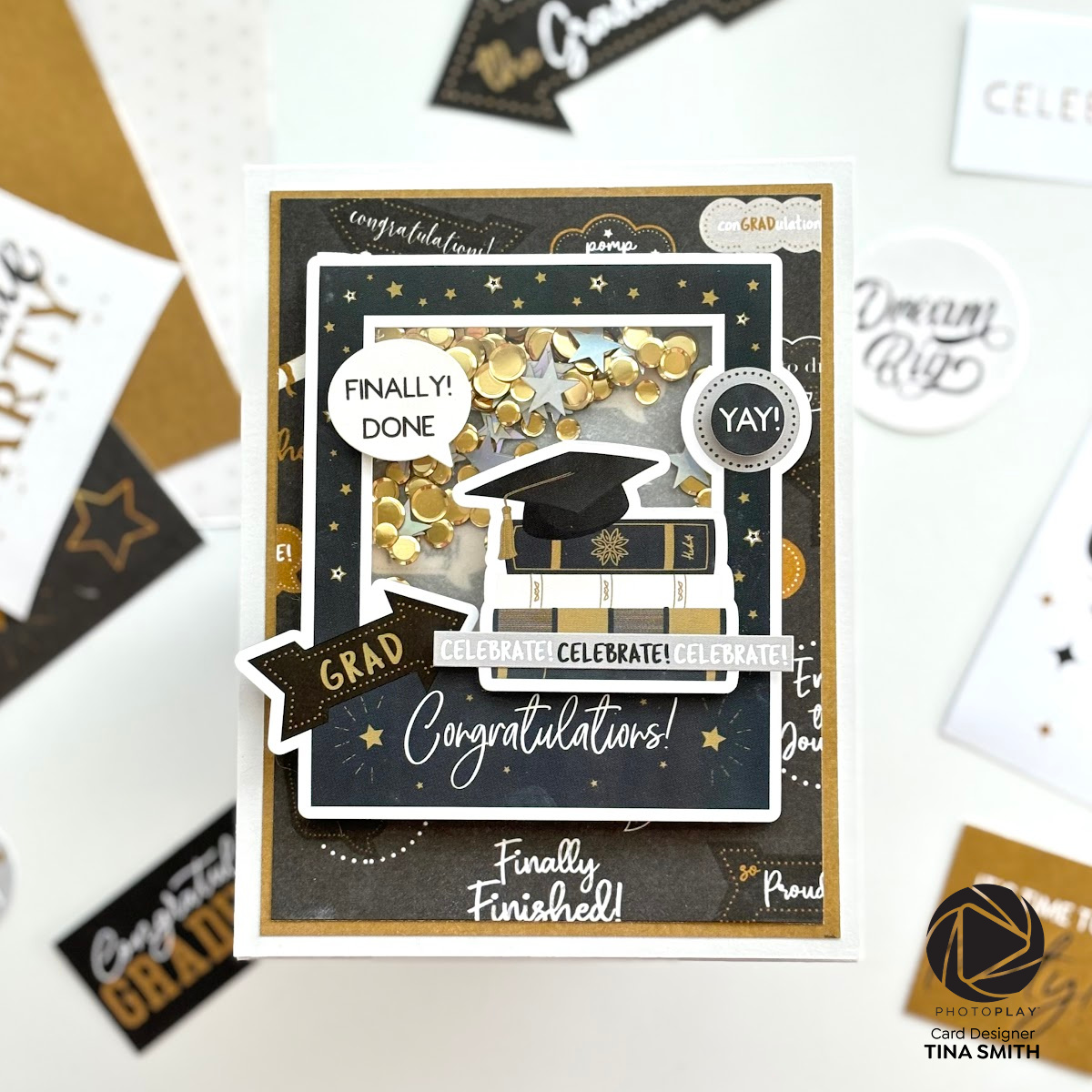 As graduation season approaches, it’s the perfect time to add a personal touch to your handmade cards. We usually add a monetary gift of some sort to the graduate and today, we’re making a unique and easy shaker card on the outside with a delightful surprise inside, along with ample space for a heartfelt message and a few other goodies. The @PhotoplayPaper Graduate Collection Pack makes this project a breeze, and did you know this collection holds an extra special surprise itself, one that you won’t want to miss out on!