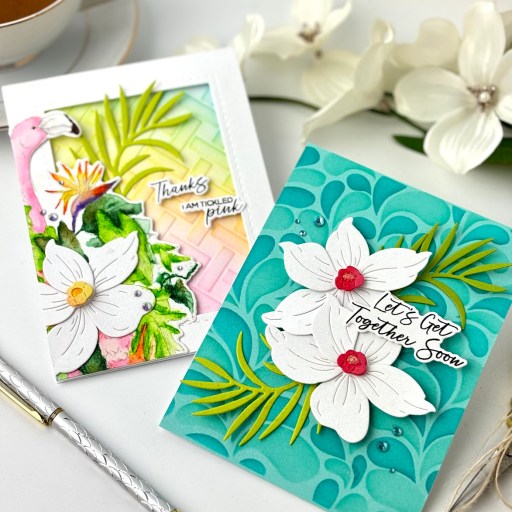 Hello Crafty Friends! Today, we’ll be exploring a tropical paradise and the wonderful world of no-line watercoloring with the Spellbinders Clear Stamp & Die Club, as well as trying our hand at ink blending with the Stencil Club and Embossing Folder Club Kit. To top it off, we’ll be indulging in some die cutting with the Large Die of the Month Club Kit. Join me as we embark on a journey to create these delightful, summery tropical-themed cards using the Spellbinders Clubs for May 2024. Let’s spread some sunny vibes and have a blast!