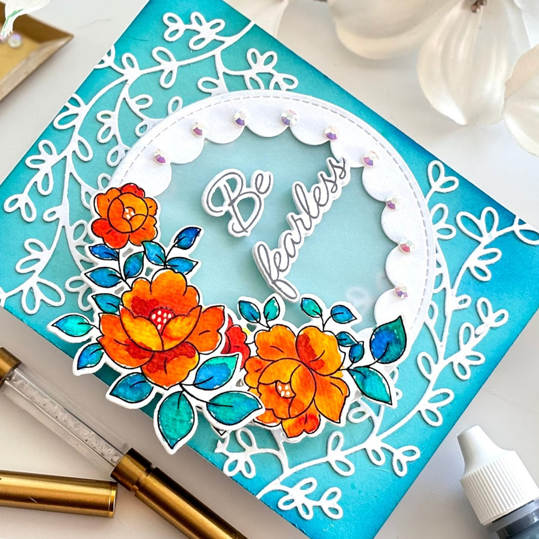 We’re diving into the joy of watercoloring today and trust me, it is easier than you think! We are using the delightful Pinkfresh Studio Premium Liquid Watercolors: Classic colors. The charming Be Fearless Stamp set features flowers that are simply made for watercoloring. I’ve also incorporated the Curvy Foliage Die into my background, as I adore the delicate, lacy touch it brings. My card project is brimming with one of my favorite color combinations – teal and vibrant orange tones, they complement each other perfectly. Be sure to visit the Pinkfresh Studio Shop and explore these creative treasures! Let’s create some crafty joy together!