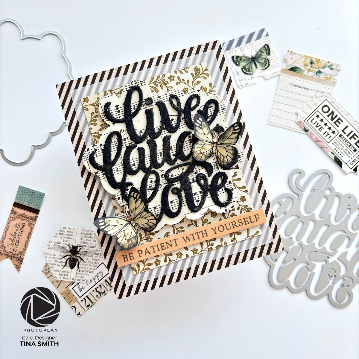 Sharing a vintage style card with a lovely greeting from Photoplay Paper. The new Say It With Stamps Die called Love Laugh Love creates a beautiful focal point on its own, and when combined with pattern papers from the Everyday Junque Collection, it truly transforms the card into something remarkable.