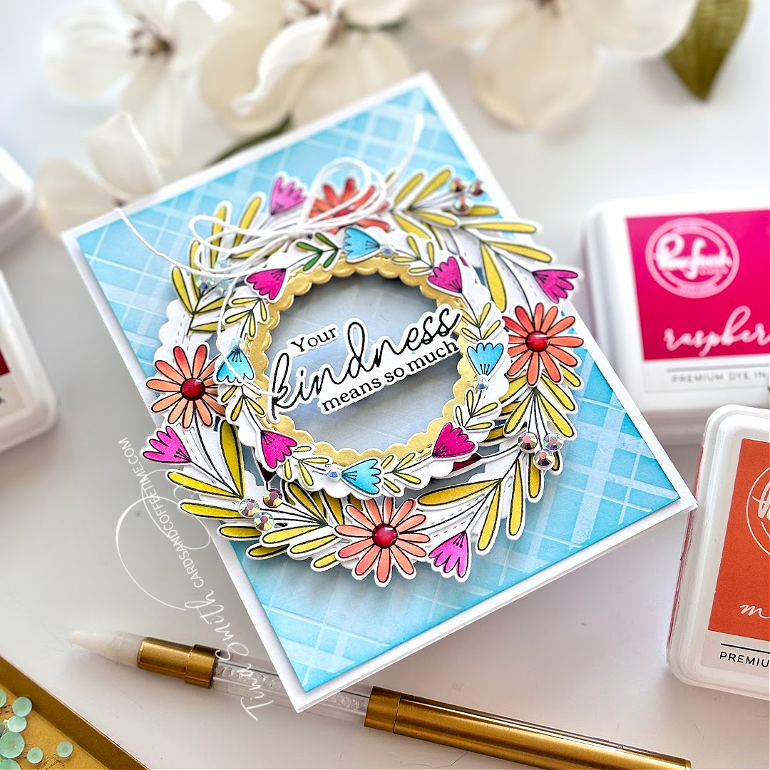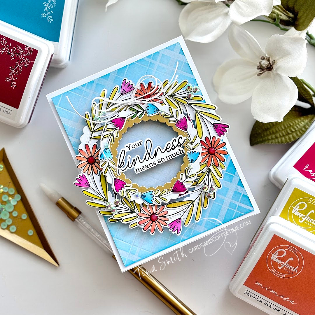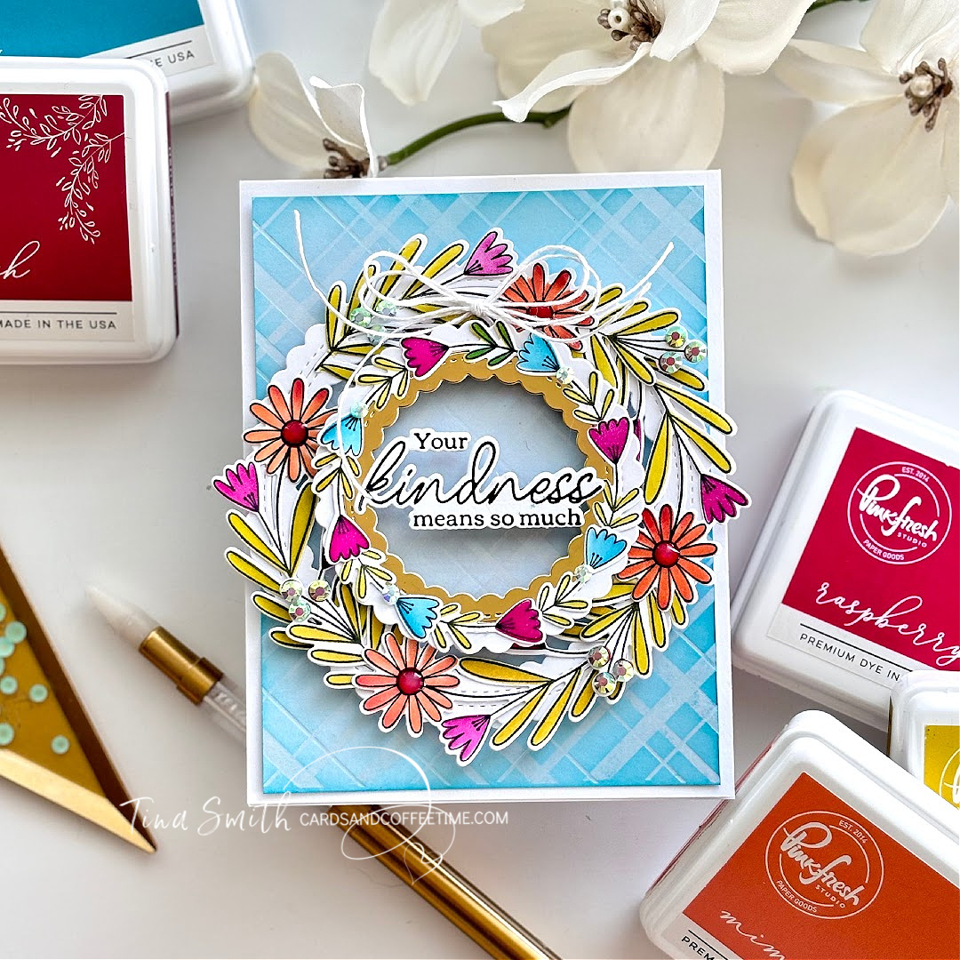 I’m thrilled to share a card project for the Pinkfresh Studio 2024 September Challenge. This month’s theme is all about wreaths and leaves. I created a double wreath with the Berries & Blossoms Stamp, Stencil & Die sets, layering them first on a circle frame I created with the Stitched Scallop Circles Die set. I created my greeting with the Favorite Things Sentiments Press Plate and placed it in the center of the wreaths.