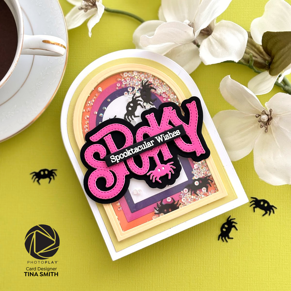 Sharing a spooky-cute Halloween Arch shaped shaker card featuring the Photoplay Say It With Stamps Die called Spooky Word & Shadow. This die certainly creates a fabulous focal point for my shaker card background – it’s so fabulous, it’s almost scary! To add to the fun, we’re using the same arches and a greeting from the Inside Out: Halloween Stamp set for both the inside and outside of our card. It’s so much fun, it’s almost spooky how cute it is!