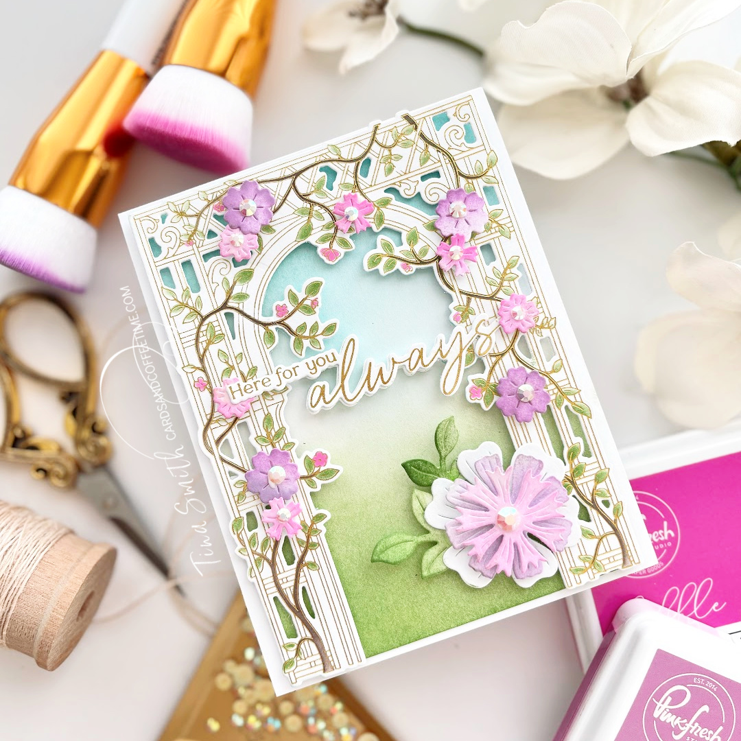 Welcome to my blog! I’m so excited to have you here today for the Pinkfresh Studio Blog Hop celebrating the amazing Kindness In Bloom Release. We’re getting crafty with the super pretty Blooming Arch Press Plate, Stencil and Coordinating Die. I used Gold Foil for stunning results and for a dimensional aspect I also added a few flowers from the Garden Party Die Set. I totally fell in love with it!