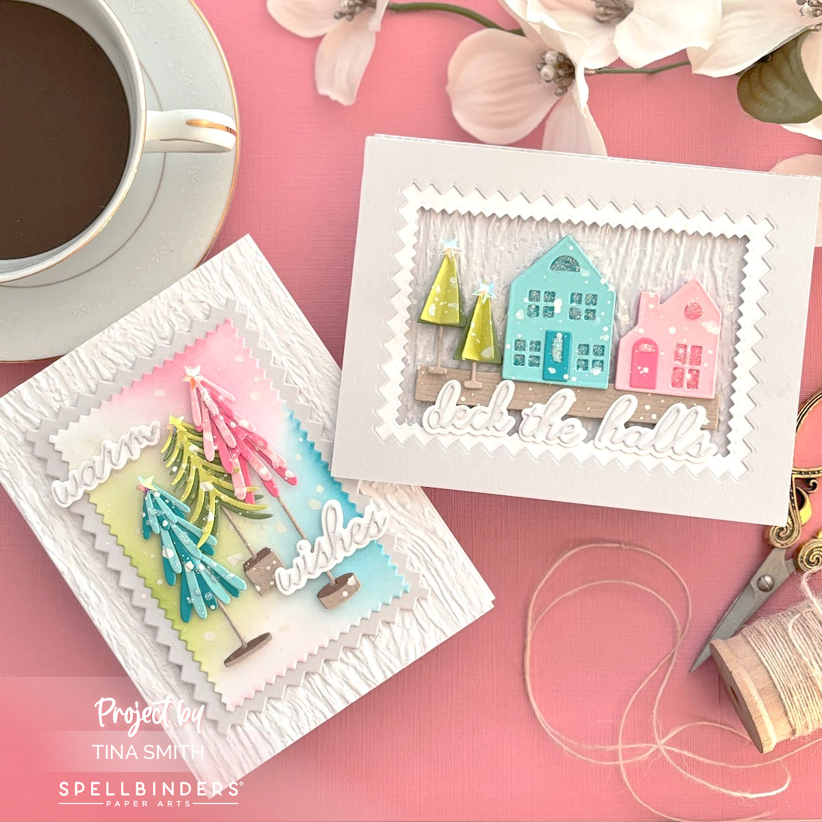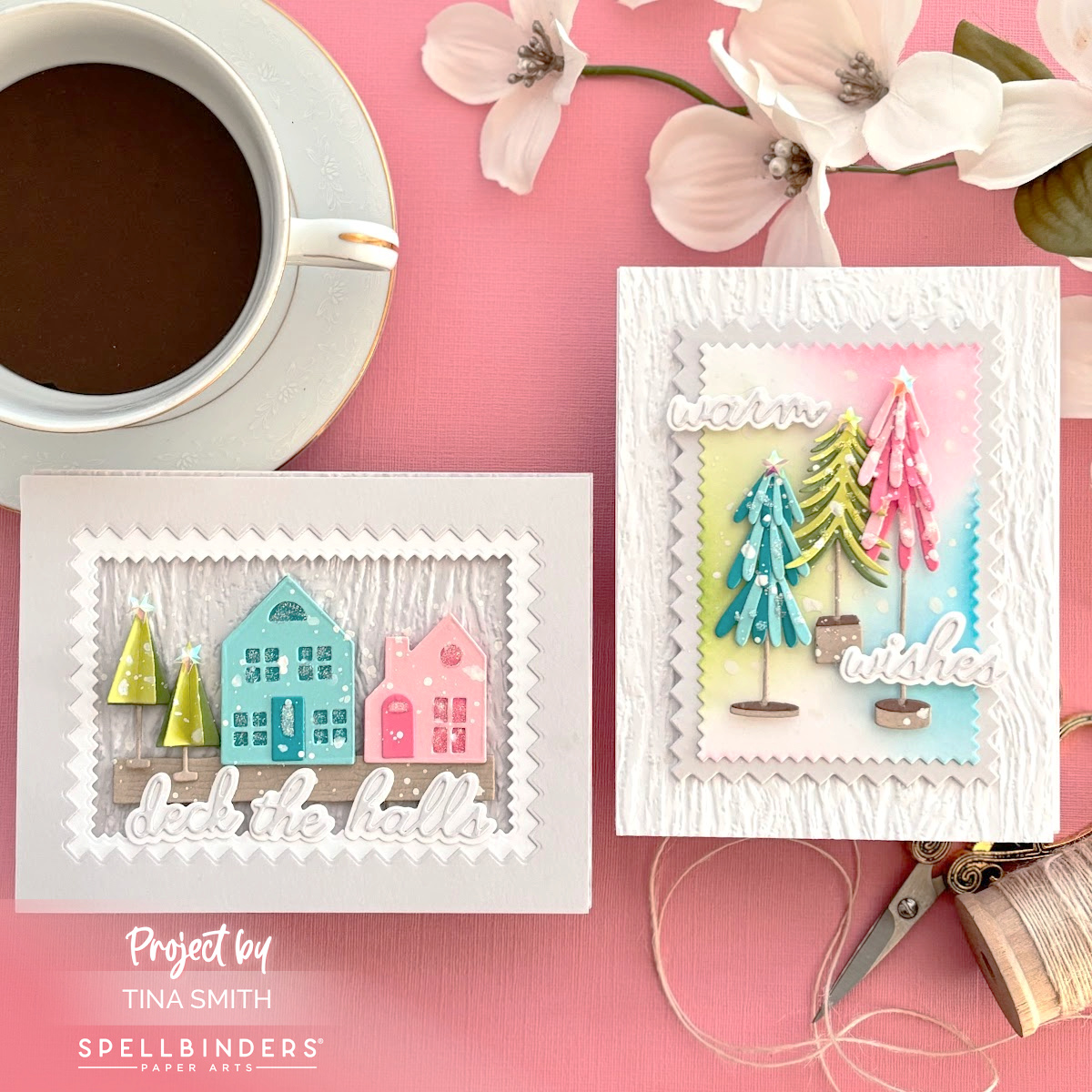 I hope you’re having a lovely day! Get ready to feast your eyes on two fun snow splattered Christmas cards made with goodies from the Spellbinders Timeless Trees Collection by Simon Hurley. I mean, seriously, this collection is so much fun. Plus, check this out – there is a fabulous embossing folder too! Hope you love them!