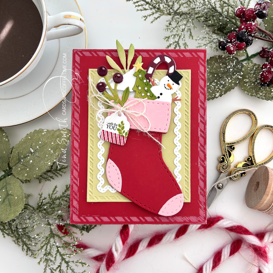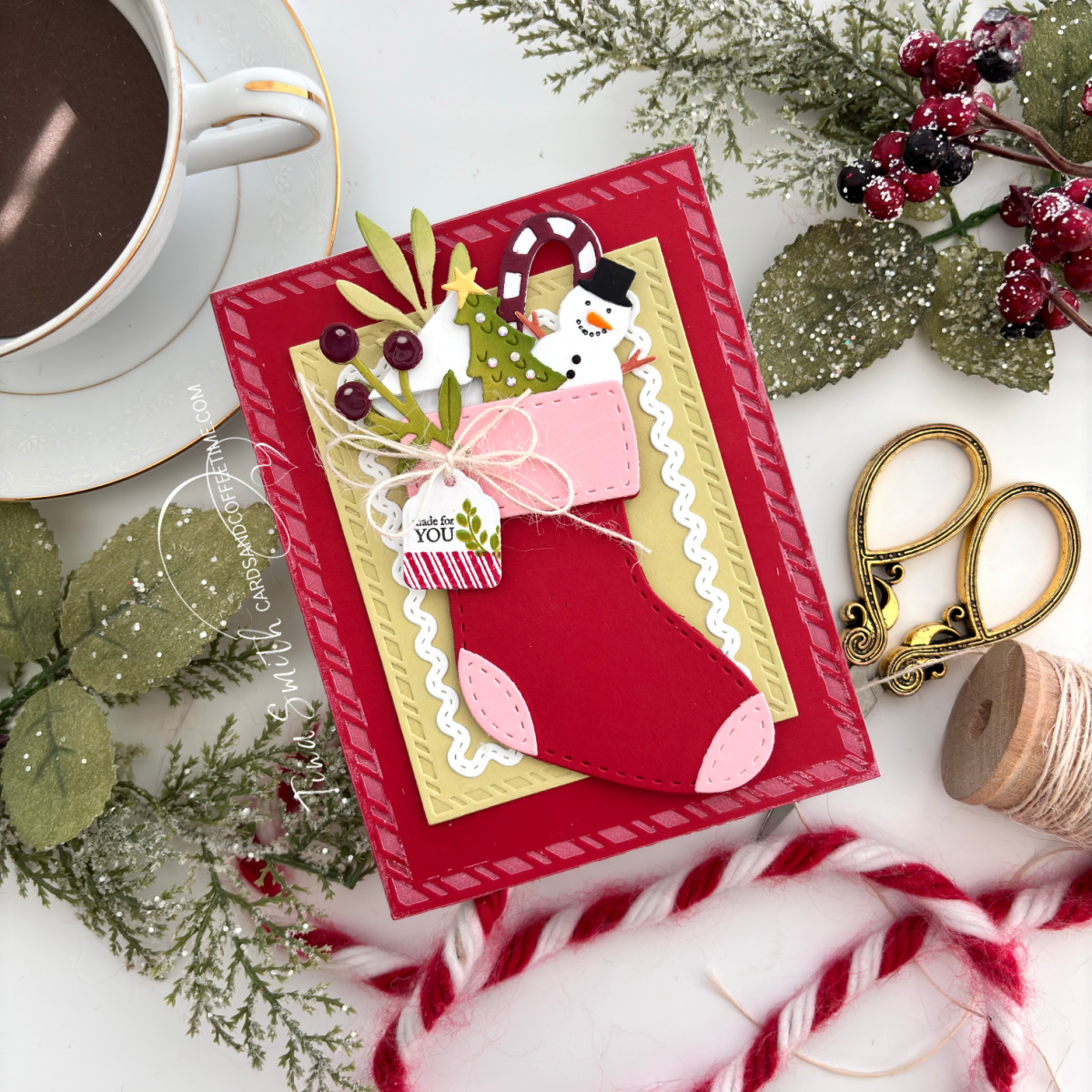 DIES: Tag it Mini’s, Build-A-Stocking, North Pole Mail: Candy Cane Frame Postage, Border Bling: Skinny Ric Rac