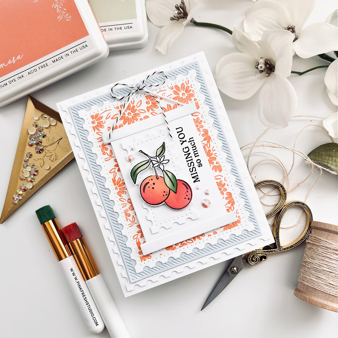Today we’re making a “Missing You” card with a refreshing feel. We’re using the Pinkfresh Studio Framed Art Stamp, Stencil, and Die set. This set creates so many mini masterpieces with the oranges I am using today, florals, and a few abstract artwork pieces. Wonderful for sending to those with the creative gene. Check out the awesome stuff at the Pinkfresh Studio Shop and get inspired by this amazing suite!