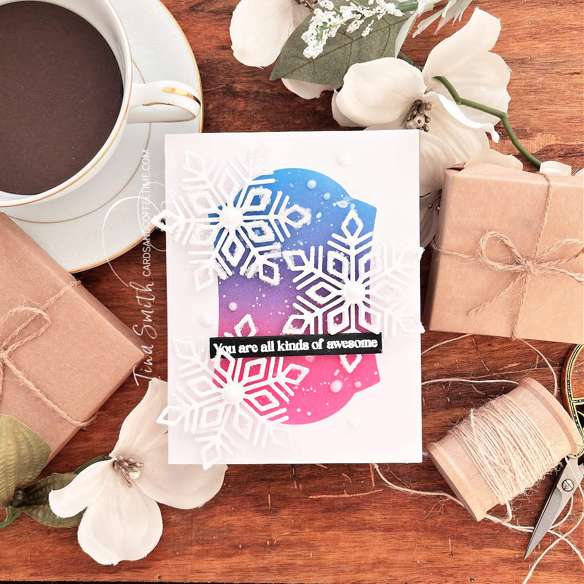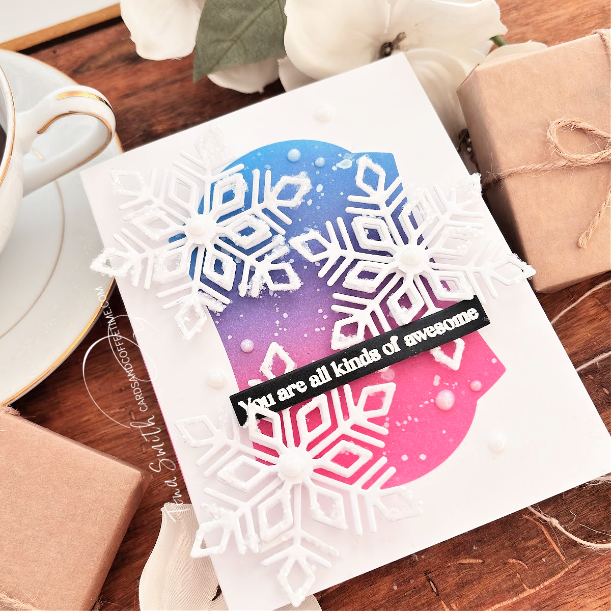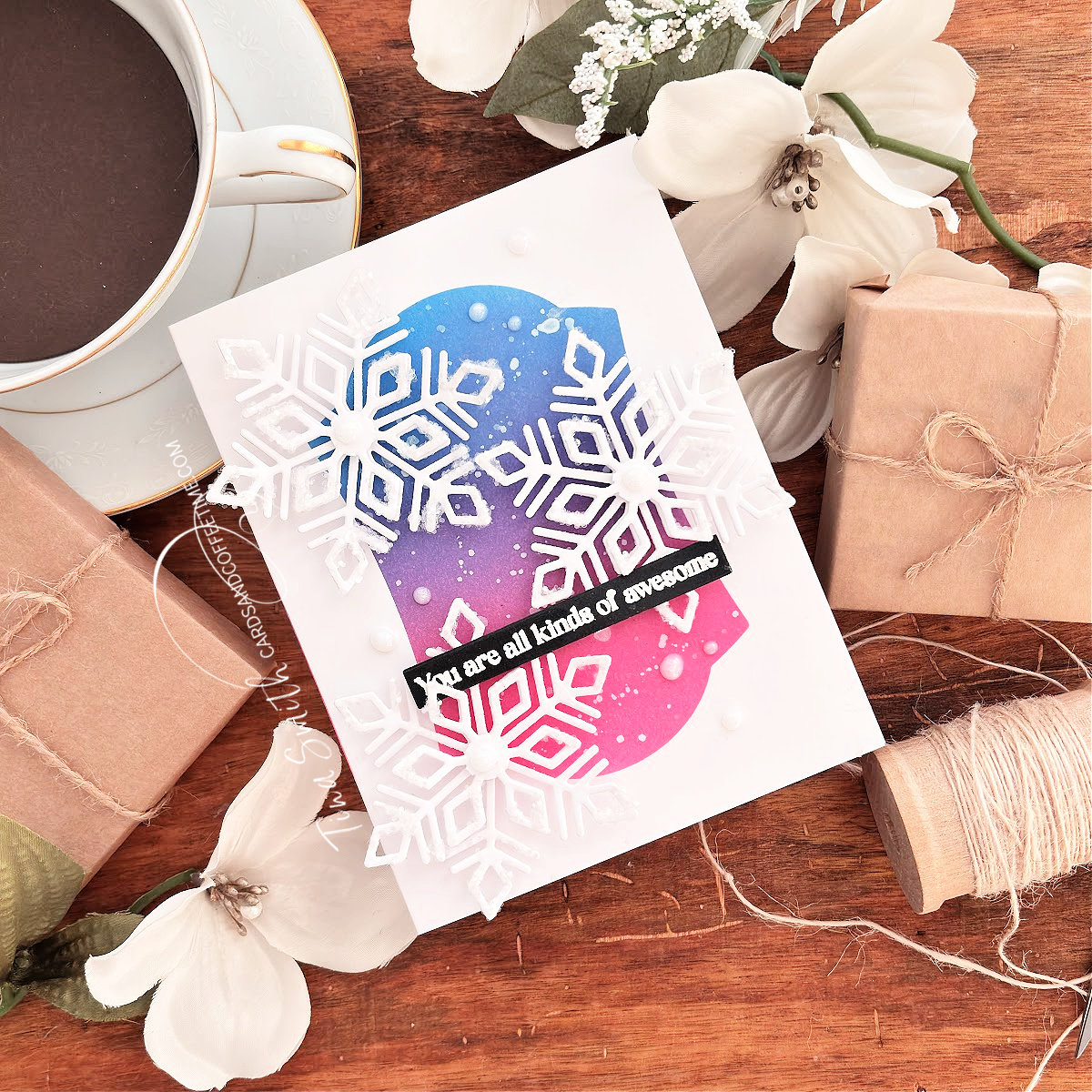 Sending warm and cheerful winter hugs with a delightful Die Set from Photoplay Paper! The Say It With Stamps Flurry Snowflake Die Set is exactly what you need to create joy-filled winter cards adorned with beautiful snowflakes. Today, I crafted a card by blending inks and masking a vibrant background using the Nested Keyplate Die set. I also layered up the snowflakes and added a touch of shimmering sparkle to bring them to life. I hope you absolutely love my project!