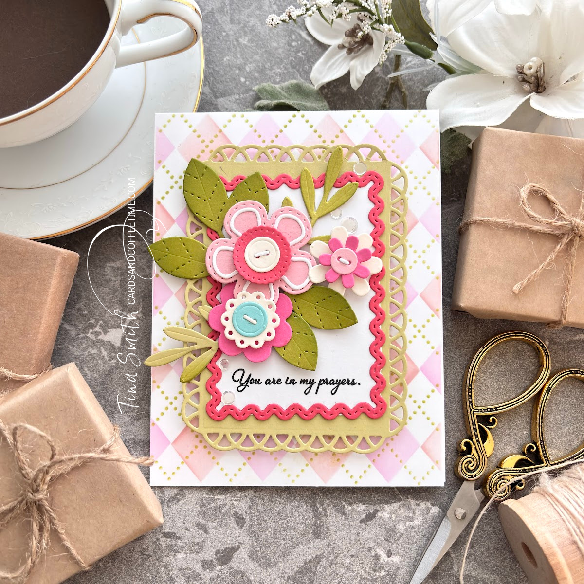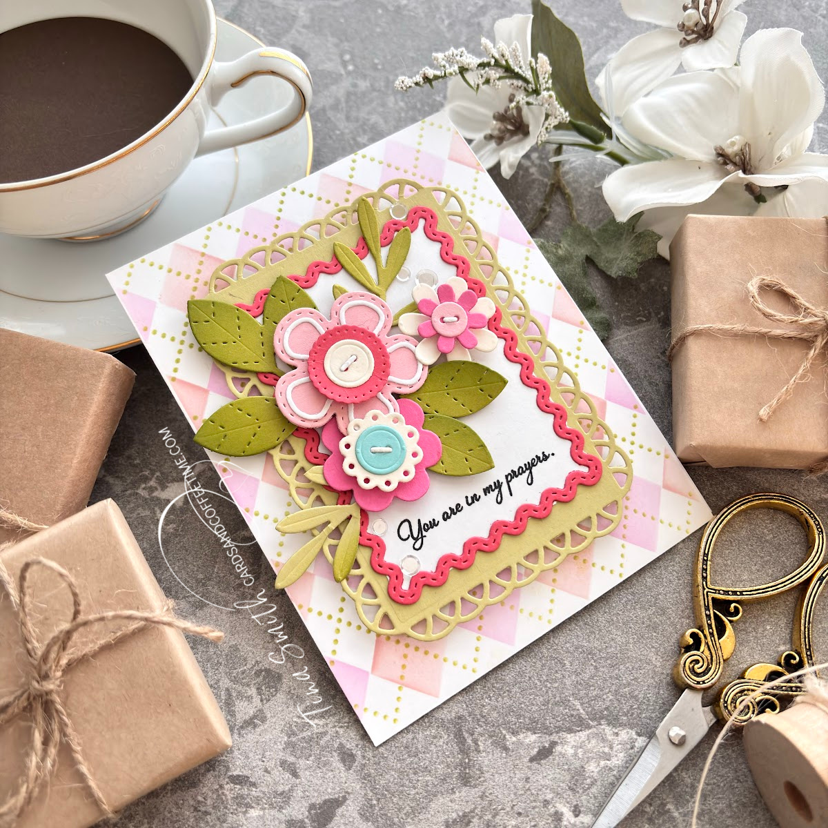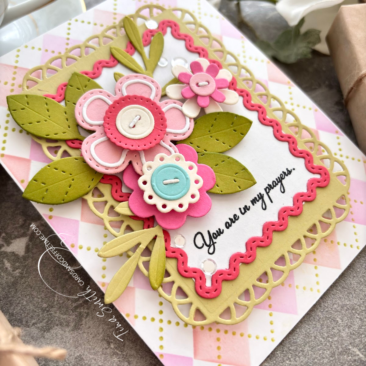 For today’s card I added an Argyle stenciled background. I used several different layers of panels for my Cute as a Button flowers to sit on. I used the Praying for You Sentiments stamp for my greeting but this is one of those cards that a different greeting can be switched out for almost any occasion!