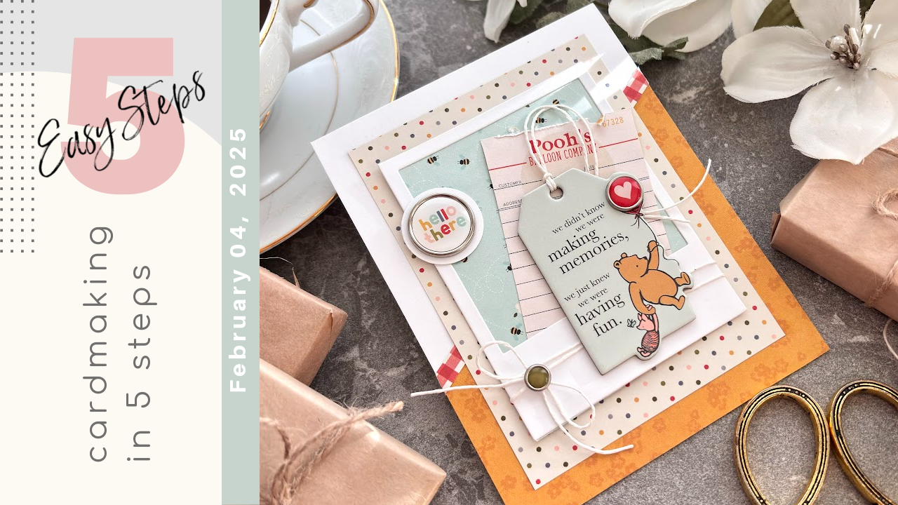 Today we are creating a just because card in 5 easy steps. We are using a Collection called Say Cheese Classic Pooh, it’s a fabulous collaboration between two amazing companies. Simple Stories and Spellbinders. We are using Decorative Brads, the Memory Frames Die Set and a few 6×8 Patterned Papers. Enjoy the tutorial:)