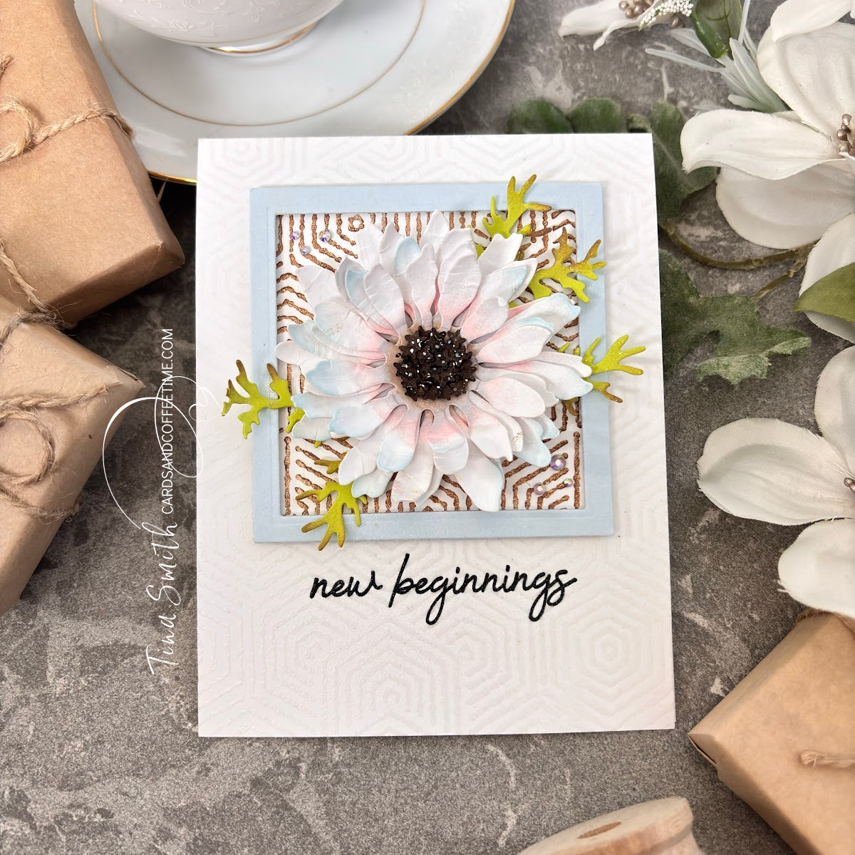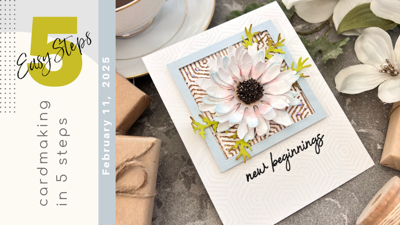 Today we are creating a New Beginnings card in 5 easy steps. No patterned paper today, we are using a background stamp and a pretty floral die. The Painted Daisy and Ladybugs Die set is a perfect focal point for today’s project. Just add any greeting you want to this card, birthday, get well, anniversaries, just because and almost any other greeting out there. Enjoy the tutorial:)