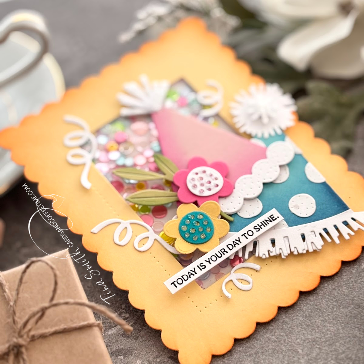 Today, I used the Fantastic Front Scalloped Frame to create a quick and easy shaker card filled with rainbow moonshine. I created 2 middle size party hats complete with polka dots, pom poms and flowers. I stamped my greeting with the This is Big Sentiments: Birthday stamp set and finished my project with some festive streamers. I love how it turned out! Watch the How-To video down below or CLICK HERE!