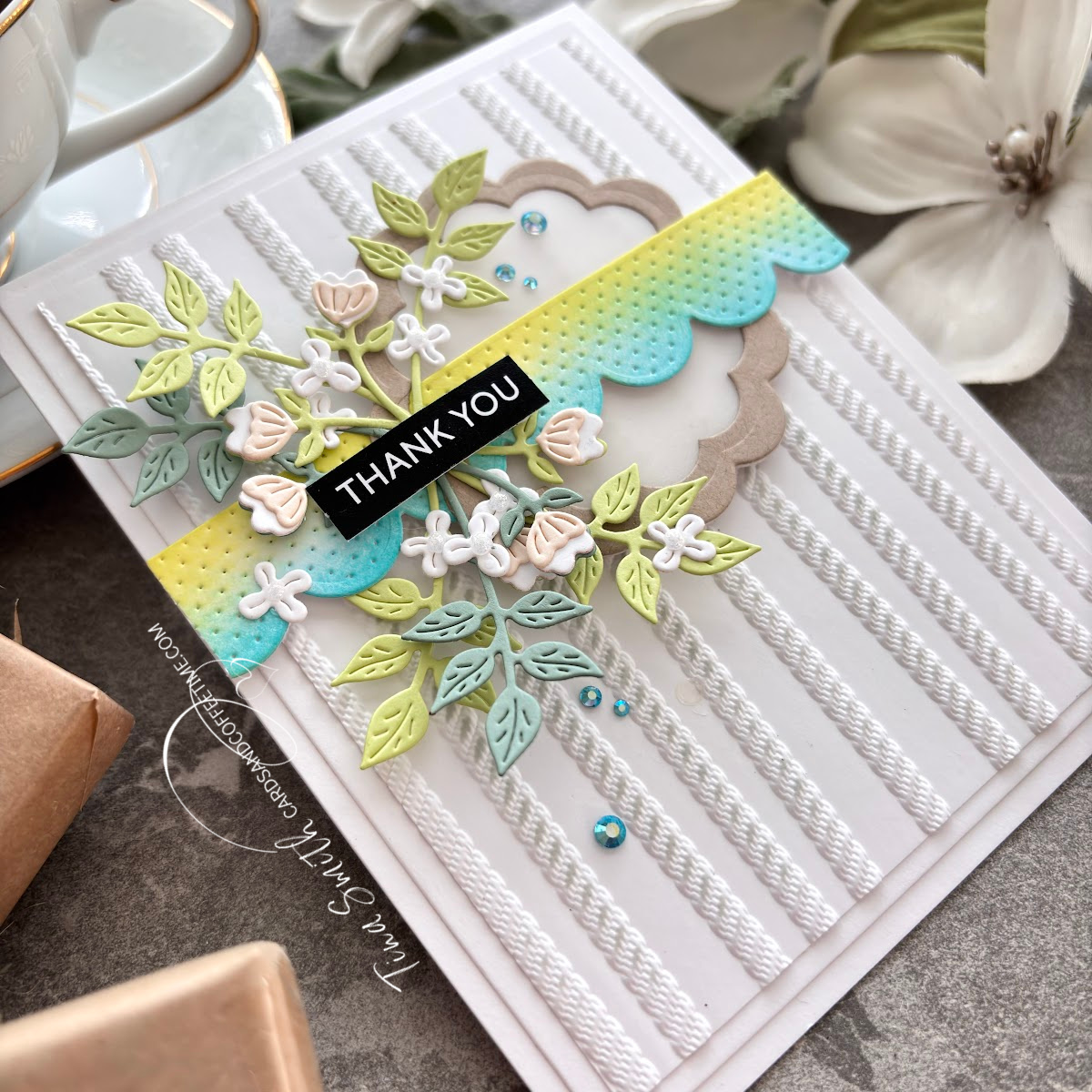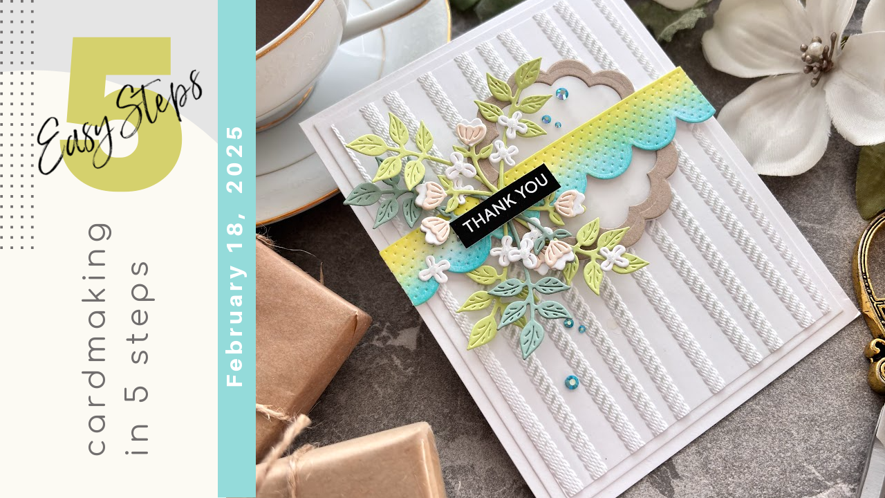 Today we are creating a Thank You card in 5 easy steps. We are using dies from the Spellbinders Simple Stories Simple Vintage Flower Shoppe Collection. No patterned paper today, instead we are using dies and an embossing folder! Enjoy the tutorial:)