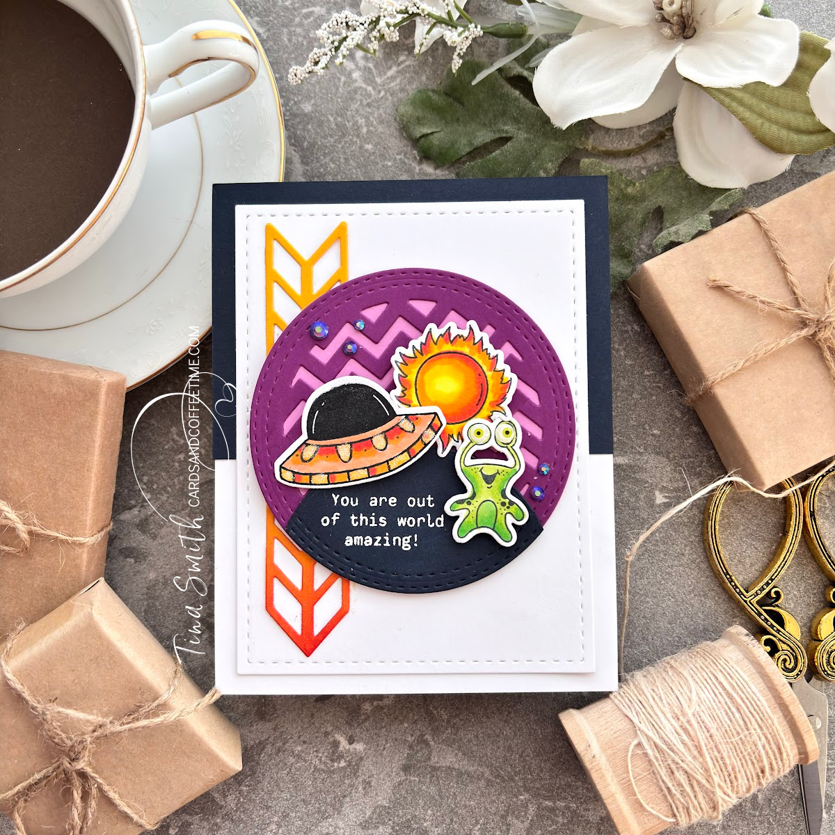 Today we are creating an Out of This World card in 5 easy steps. We are using the Simon Hurley Space Friends Stamp and Coordinating Die set at Spellbinders. I love the aliens in space scenes because they make me smile, I know the recipient of this card will smile too! Enjoy the tutorial:)