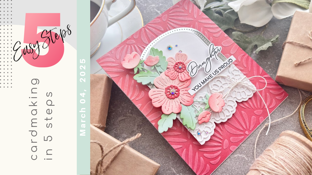 Today we are creating a dainty Daughter, You make us proud card in 5 easy steps. We are using several Spellbinders Club Kits, the Large Die of the Month Club, the Clear Stamp and Die Club Embossing Folder Club kits. Enjoy the tutorial:)