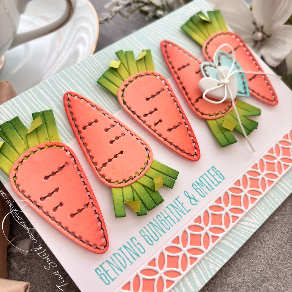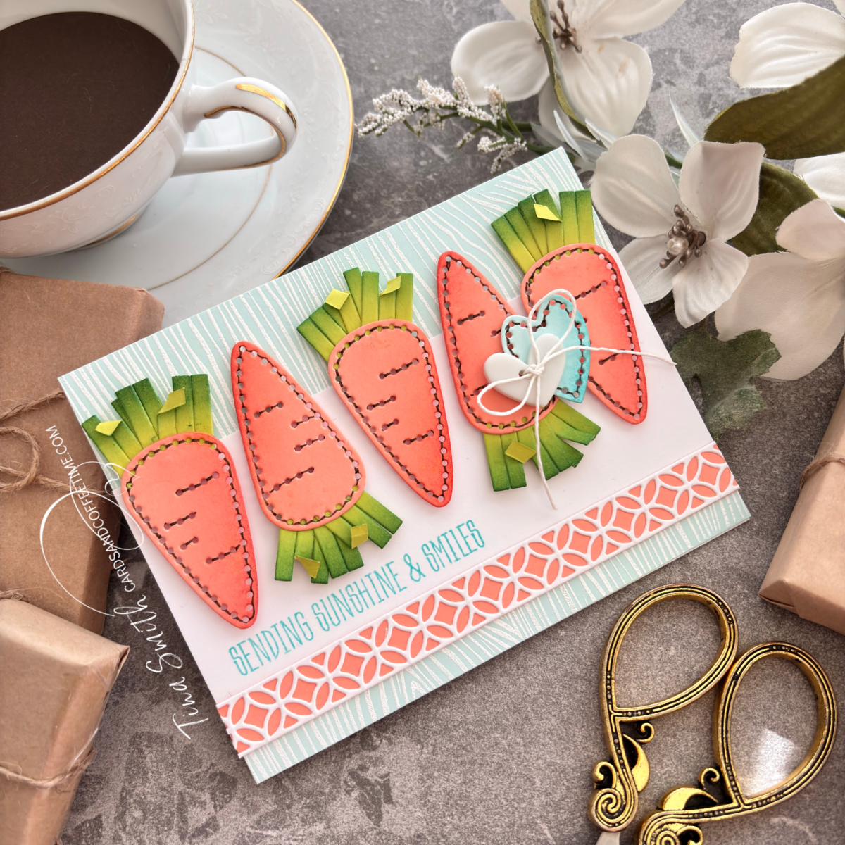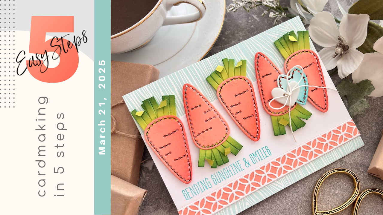 Today, we are creating a card in 5 easy steps. I am using the carrots in the Felt Carrot Companion Die set from Spellbinders Spring Felt Stitch and Create Collection designed by Nichol Spohr. This die set is intended for felt stitching but today we are doing faux stitching on cardstock, it’s so much fun and really easy to do! Enjoy the tutorial:)