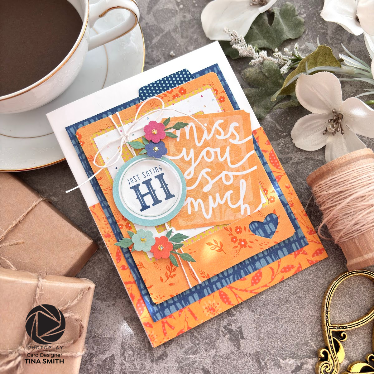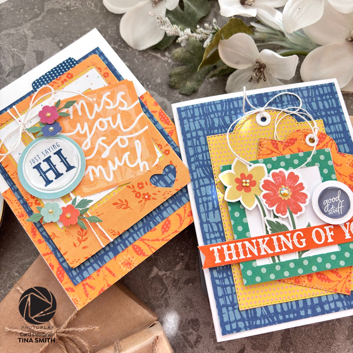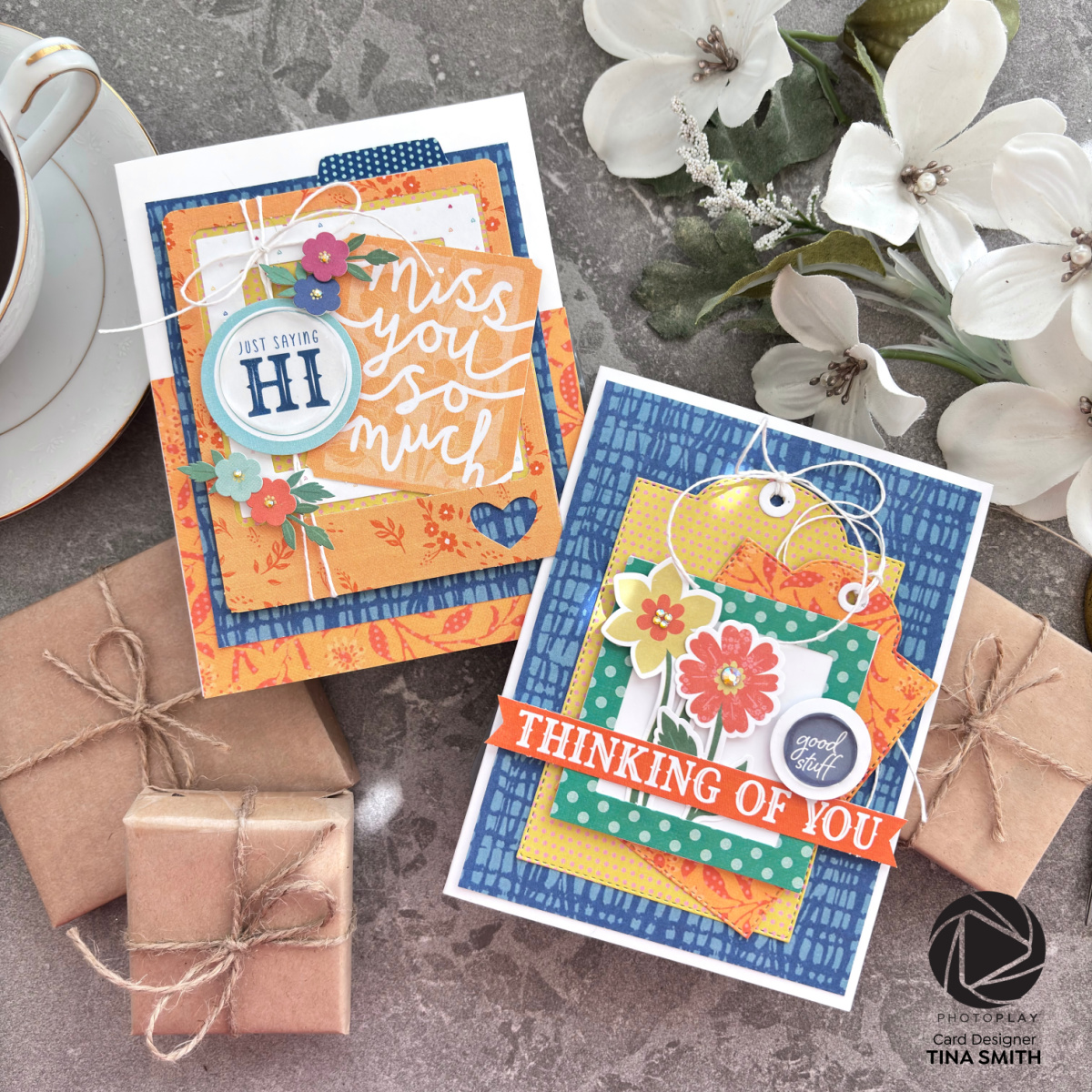 I’m excited to show off two fun collage cards made with an awesome Photoplay Paper 12×12 Collection! We’re whipping up a Miss You card and a Thinking of You card using the This Happy Life Collection. We’ll be playing with some vibrant patterned papers and stickers for all the layers, plus throwing in a few cool ephemera pieces from the This Happy Life Ephemera Pack.