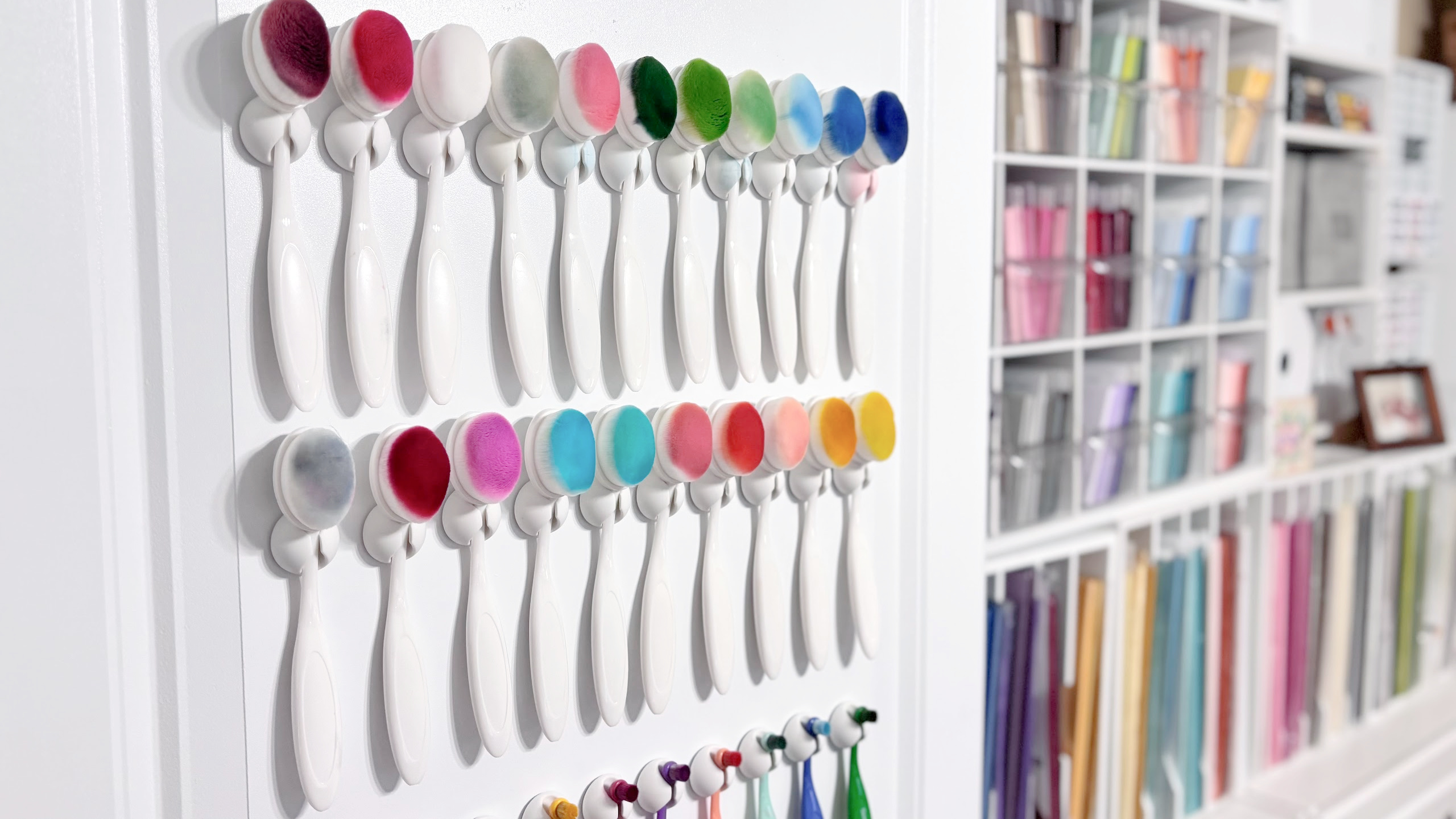 I hope you are having a lovely day. Today, I am popping in and sharing a new Blending Brush storage idea that I created for my craft room. It’s inexpensive and easy to use. I have been using it now for a few months and love it. It’s simple to set up and it makes it easy to place and remove any size and/or brand of blending brush with a handle. I had to share this fun hack with you. Enjoy!