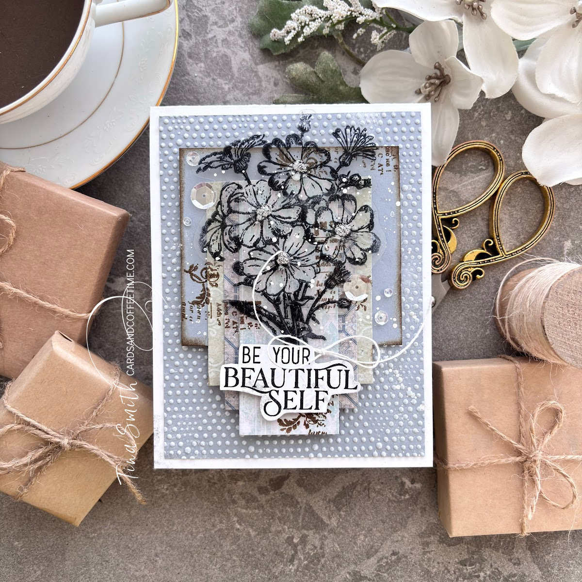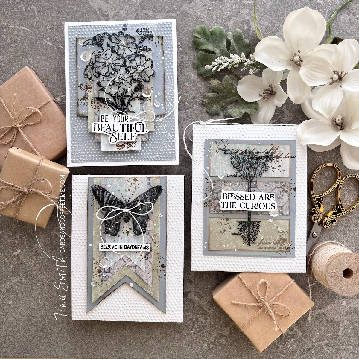 I’m excited to share with you three Vintage style cards, using just the card kit contents and a few basic craft room supplies. Inside the lovely latest Simon Say Stamp May Card Kit called Beautiful and Curious, you’ll find lots of mixed media crafty goodies. Today, I am focusing on the patterned papers, embossing and stamping on acetate for a floating effect. I love how they all turned out and hope you love them too.