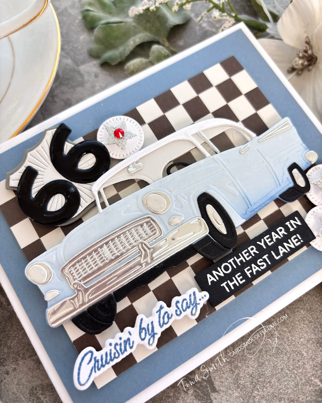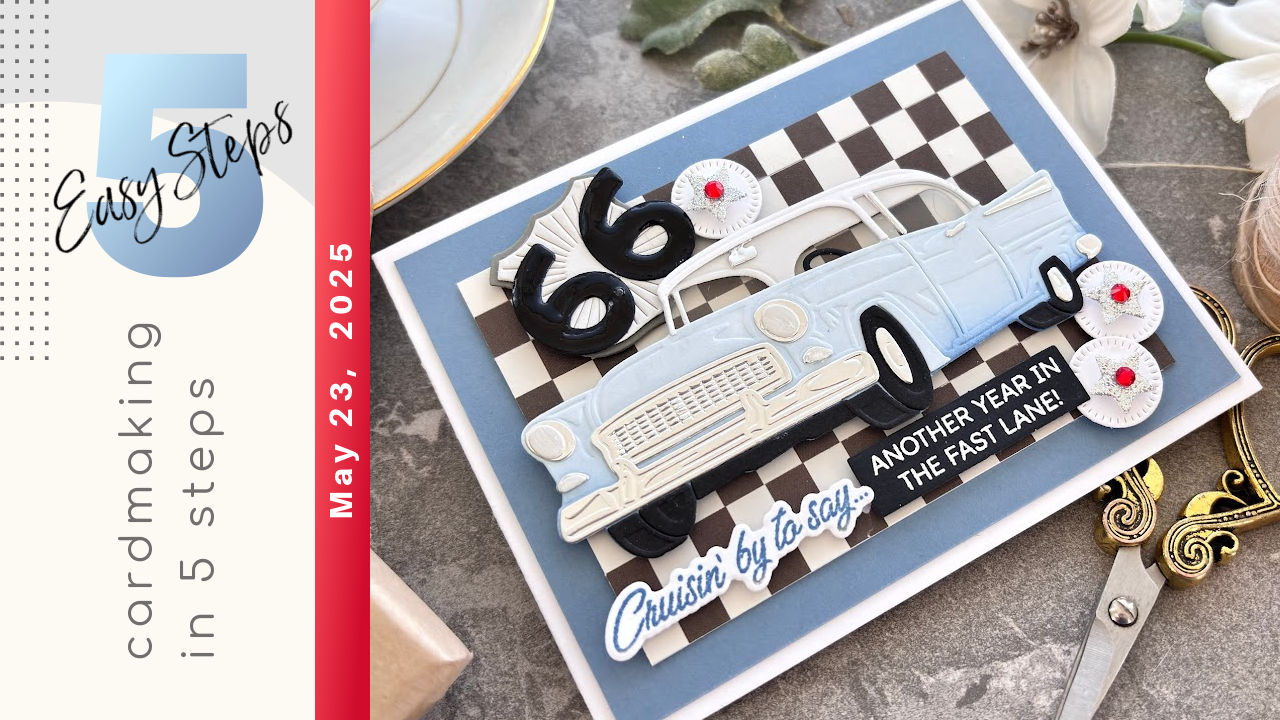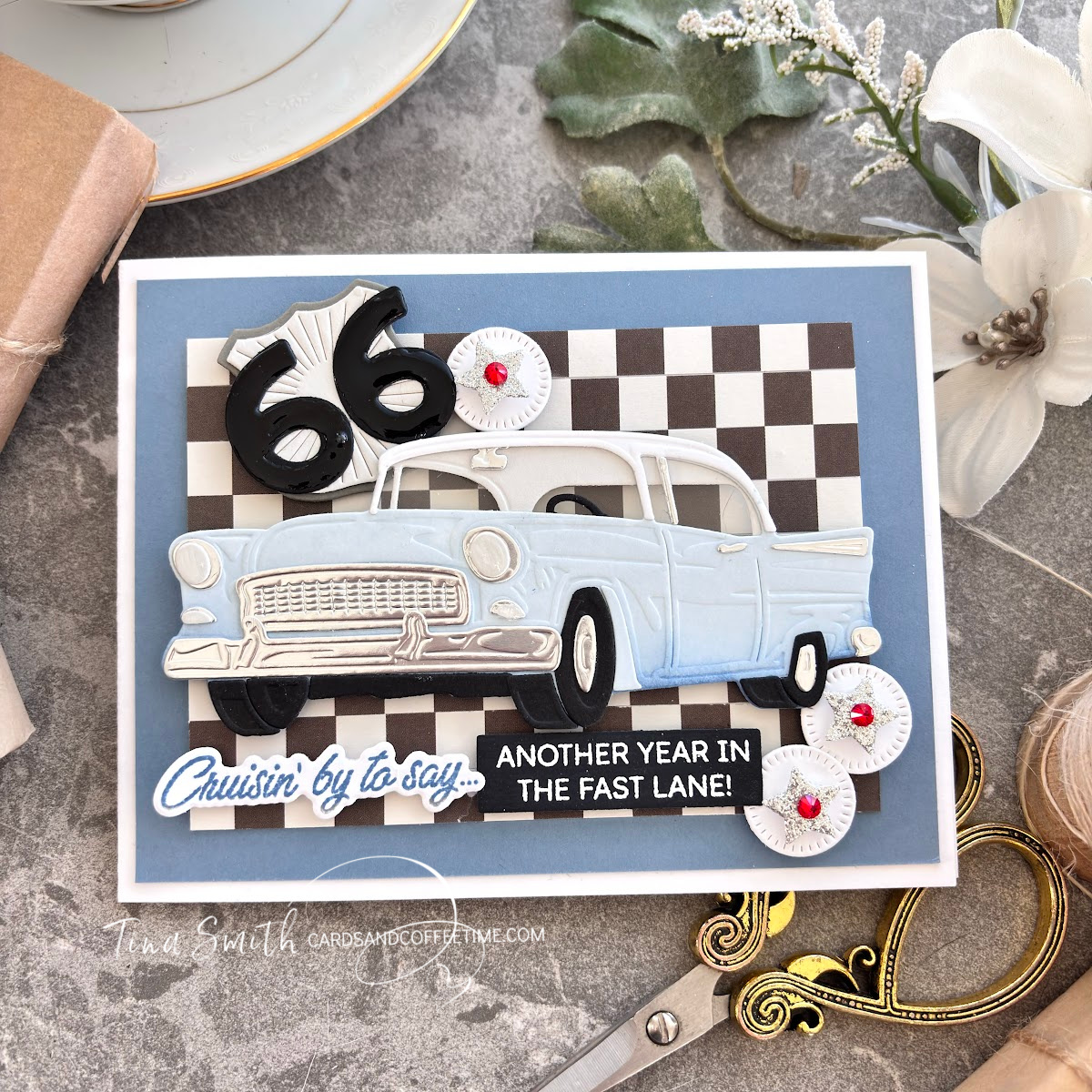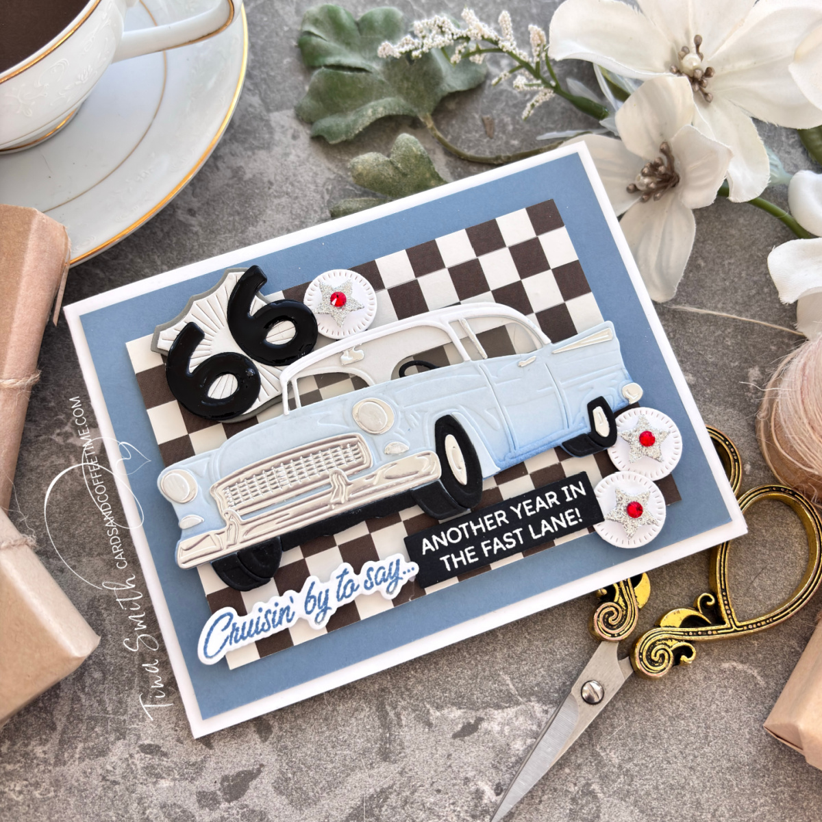 Today, we are creating a masculine birthday card in 5 easy steps. We are using a few items from the awesome Classic Road Legends Collection designed by Mindy Eggen. Classic Cars remind me of my Auntie’s Thunderbird, so I went with a light blue car. Also when I think of classic I think Retro Diners and had to throw in a checker pattern. Enjoy the tutorial:)