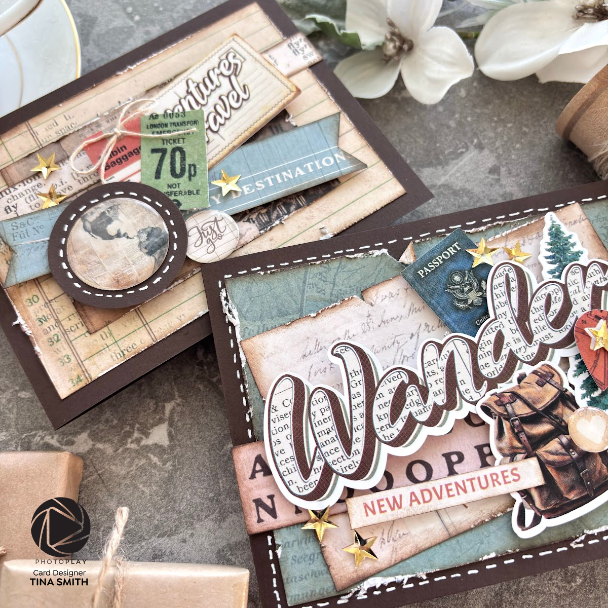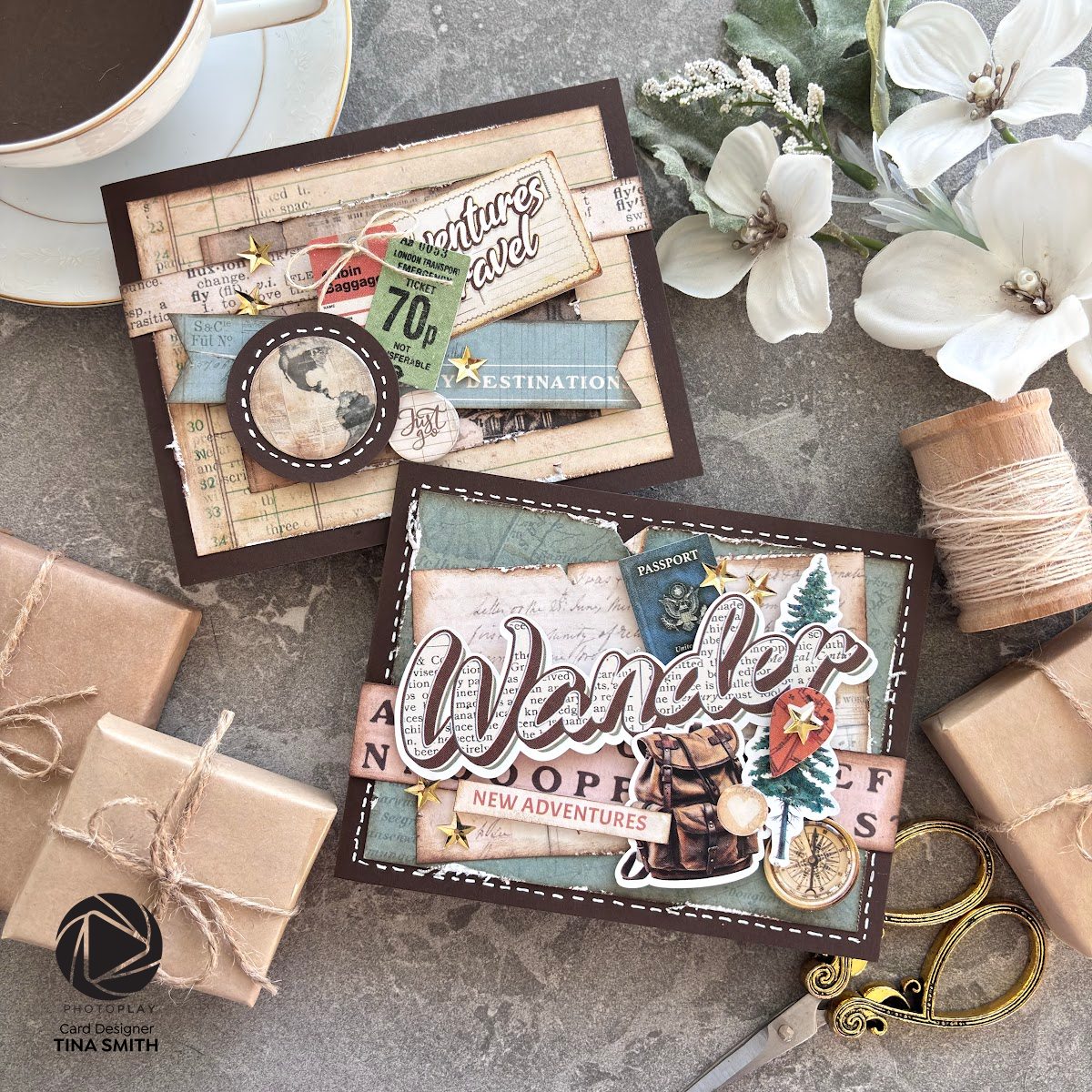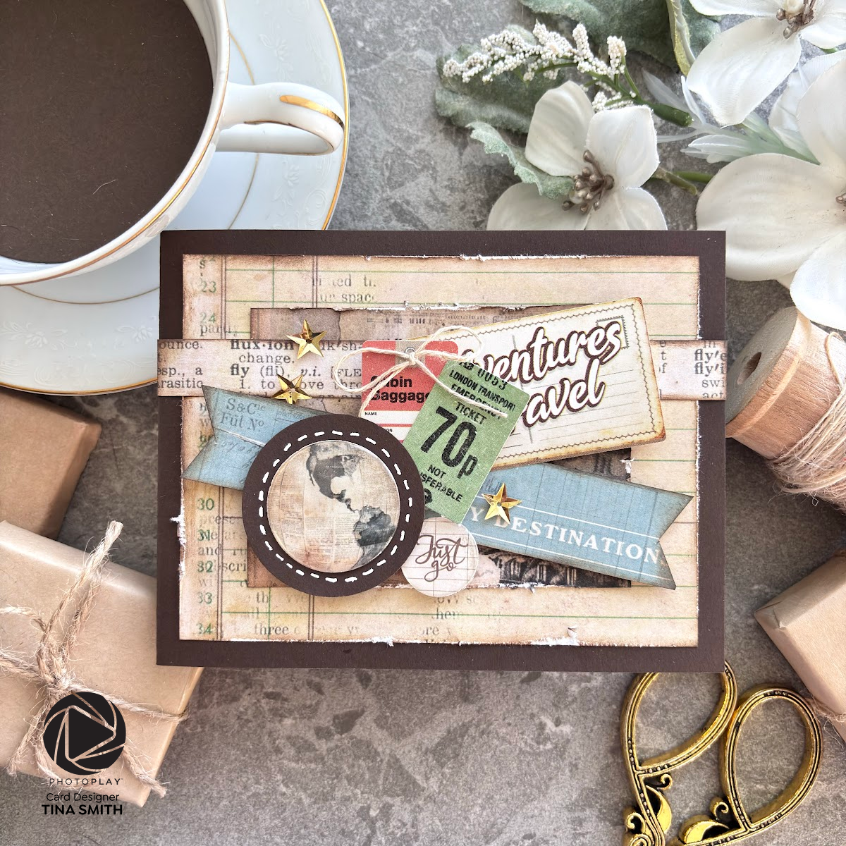 I’m so stoked to share with you two collage cards I made using a super fun, adventure-packed Photoplay Paper 12×12 Collection! We’re highlighting all the cool stuff from the Travel Junque Collection. I used some awesome patterned papers, wanderlust stickers, and the matching Travel Junque Dies Paper, plus those fab Epoxy Circles & Buttons. Oh, and I’m whipping up some coordinating color card bases with the My Colors Cardstock Travel Junque Variety. Enjoy!