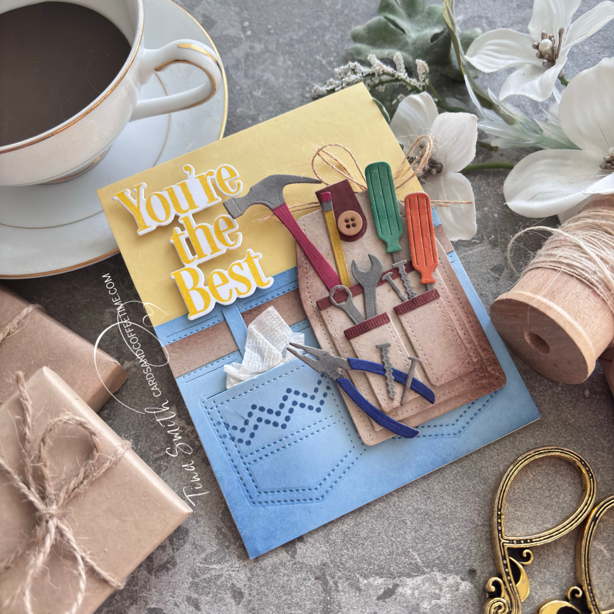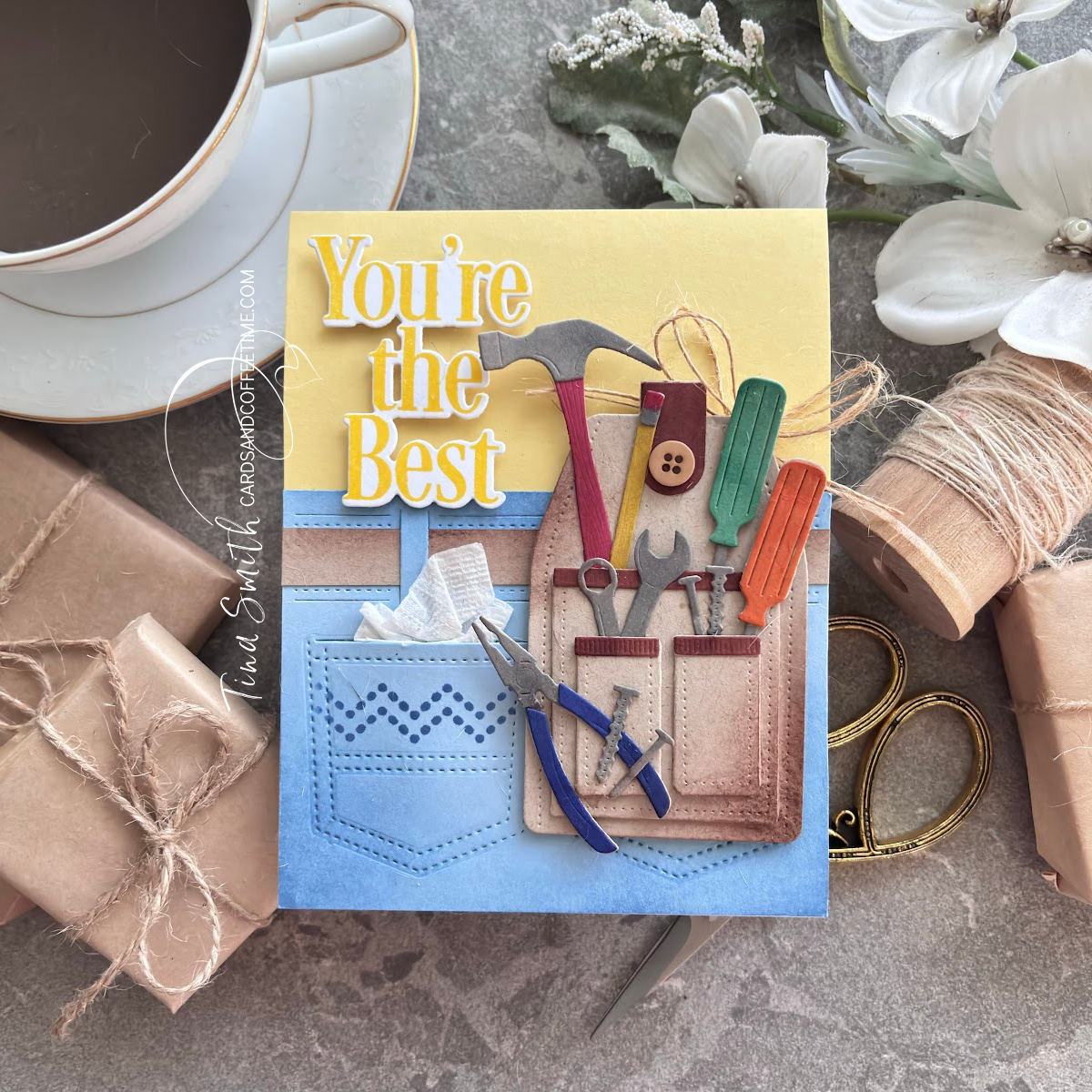 Today, I used the Elegant Edges: Jean Pocket and coordinating stencil to create a fun pair of jeans. I die cut the Tool Pouch along with a few tools for stuffing inside and placed it on the “belt” of the jeans. I stamped my greeting with the This is Big Sentiments – You’re the Best Stamp set and coordinating die. I love texture on cards and added some twine and tissue too. 🔨