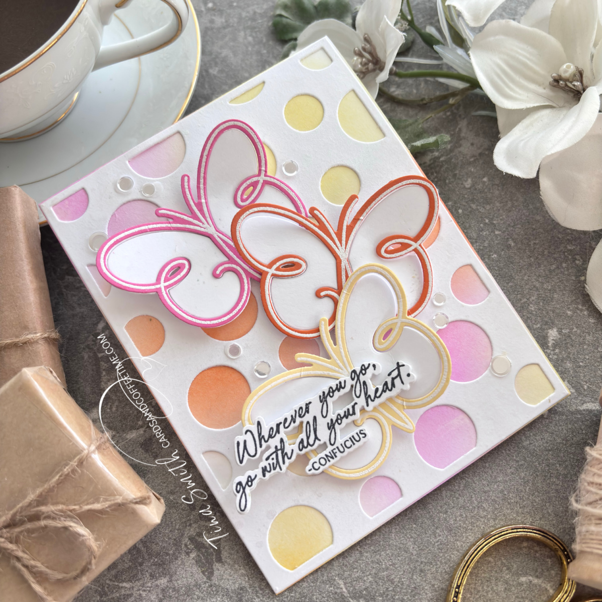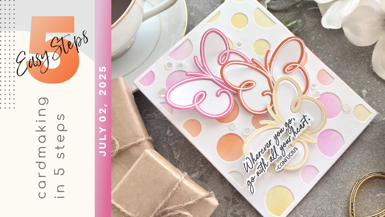 I’m absolutely thrilled to share with you a Just Because card with the lovely Winged Serenity Die set from Papertrey Ink. We are also using the Wish You Were Here Stamp and Coordinating Die both are from the awesome April 2025 Release. These butterflies just had to with polka dots, I love how playful they are! Enjoy and be sure to visit the Papertrey Ink Shop and discover the latest Release Here!