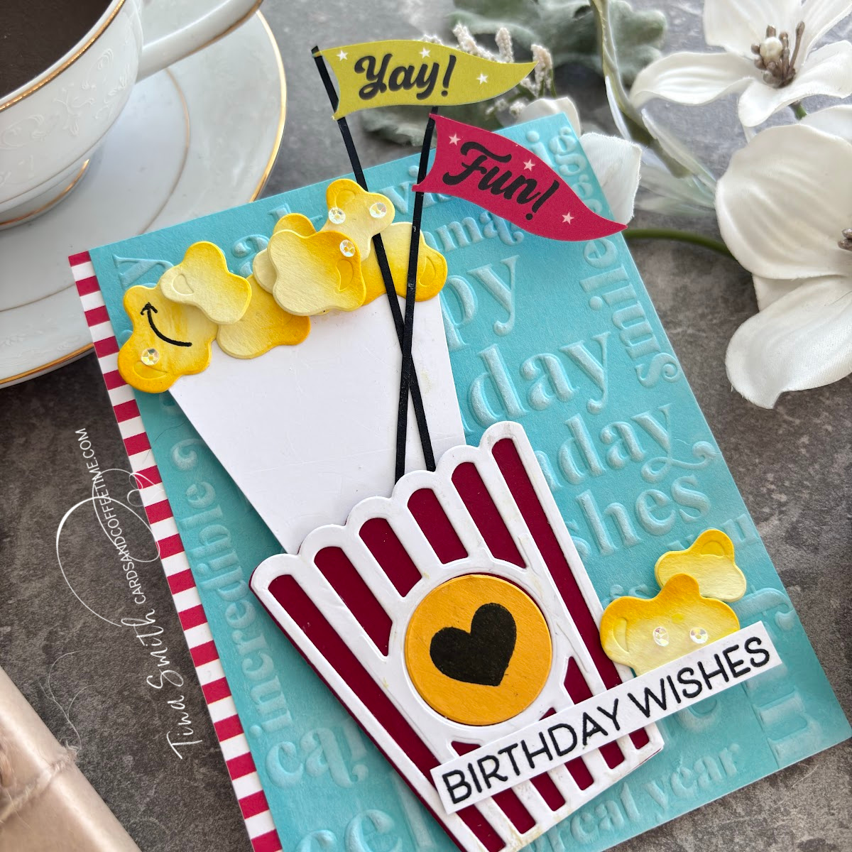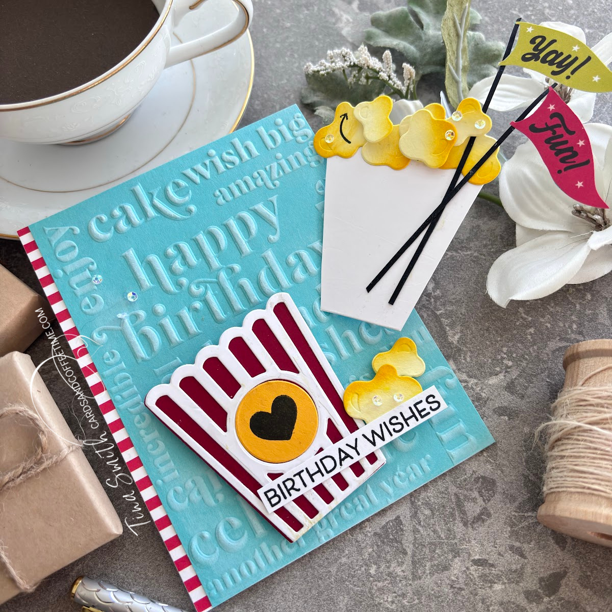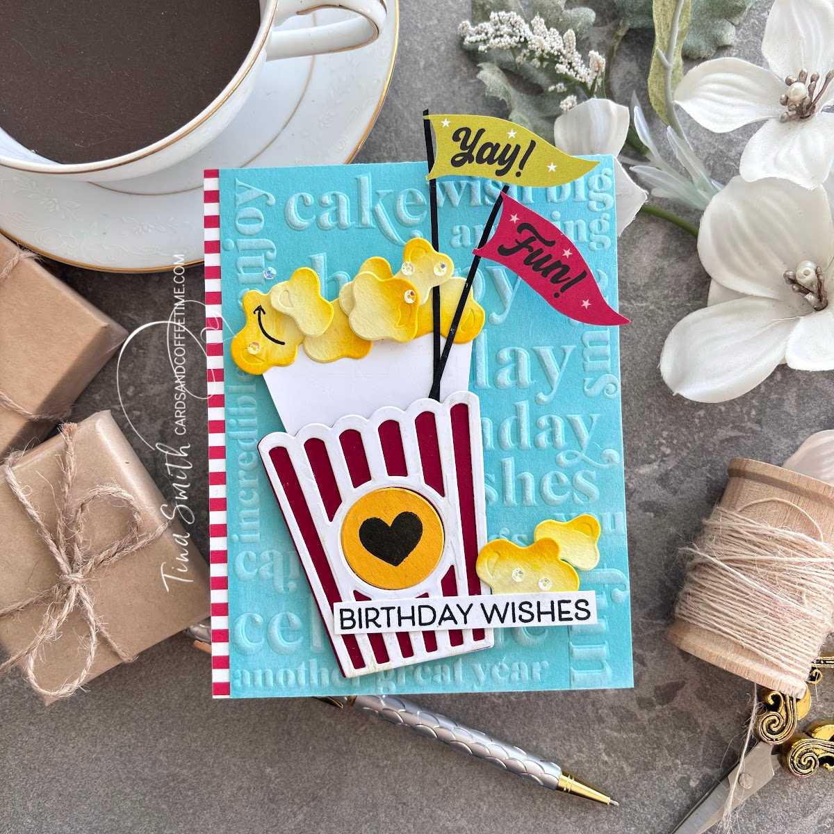 I’m excited to share with you another card, using just the Birthday Blitz card kit contents! Today’s card has a special feature. The popcorn container created with the Poppin’ Corn Die and a few cut outs from the patterned paper makes this card extra special! Creating a pocket that you can write a fun message in or even add some birthday cash too is super easy to create! Bring on the Birthday fun! I love how it turned out and can’t wait to share it with you! Enjoy the tutorial!