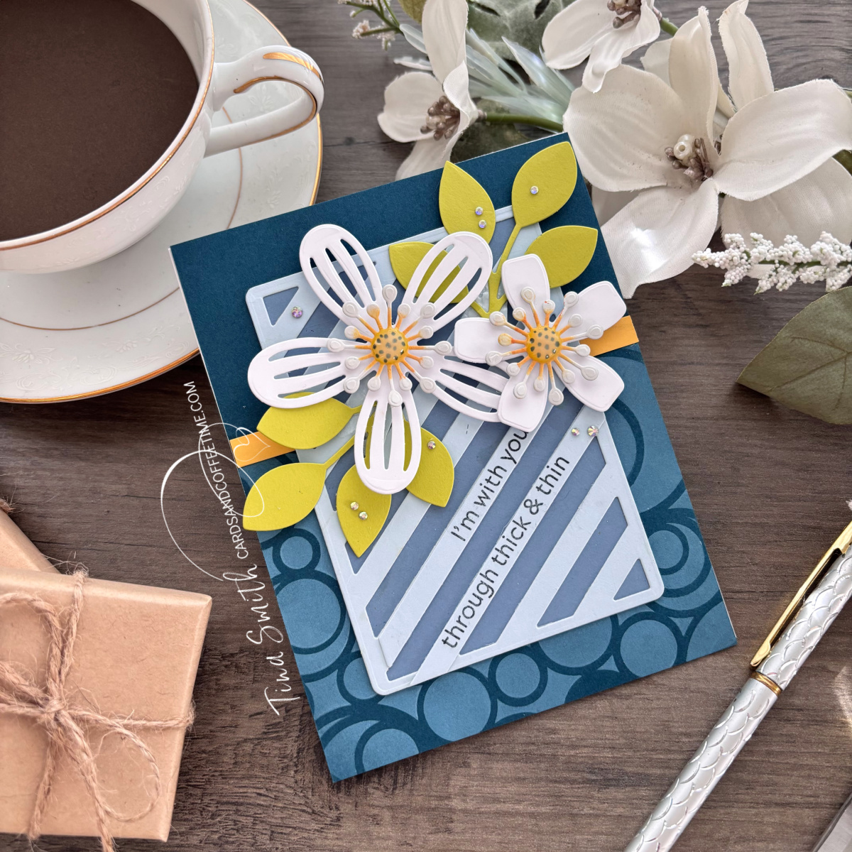 Next, the focal point gets a cozy home. The Spellbinders Lots of Stripes Die set adds texture and interest. A coupon code is available for 10% off your next purchase at Spellbinders. Use code TINA10 at checkout-good for 10% off any Spellbinders branded product (excl clubs, clearance). This is one of my TOP 3 Picks over at Spellbinders! Promotion valid from 10/20/2025 through 11/16/2025 at 11:59 PM PST, more details below.