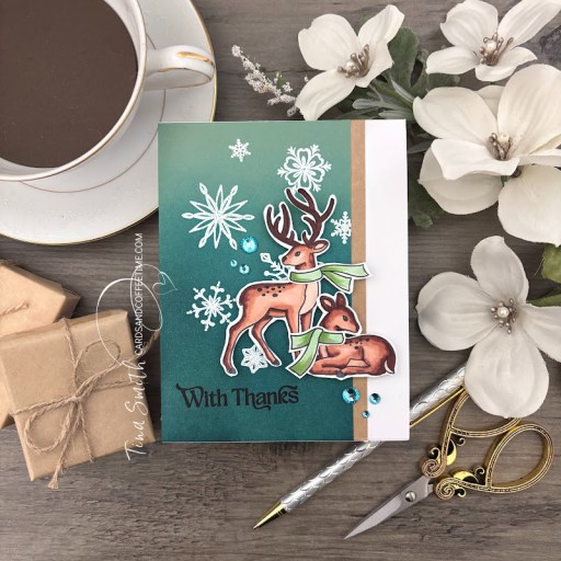 For the final card, the “The Small Things” stamp set was used. Both reindeer images were stamped along with the scarf, fussy-cut, and popped up in the corner. I ink blended sage cardstock that was heat embossed with the snowflakes in the stamp set.
