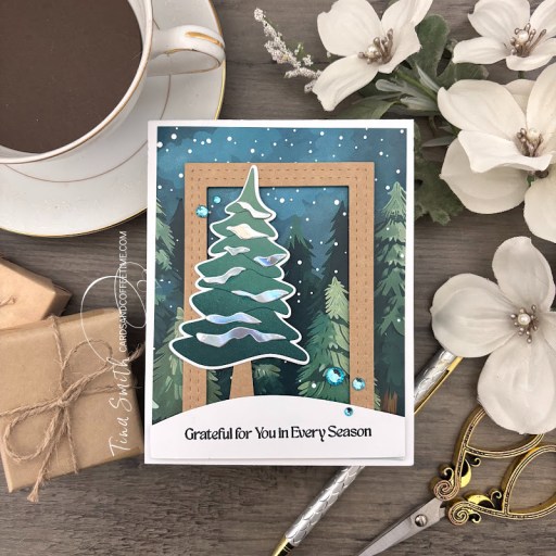 The included Snowy Tree die set was used to create a framed tree making this a lovely focal point. Adding Holographic snow caps on the tree makes it shine bright, making it a standout feature against the patterned paper behind it.