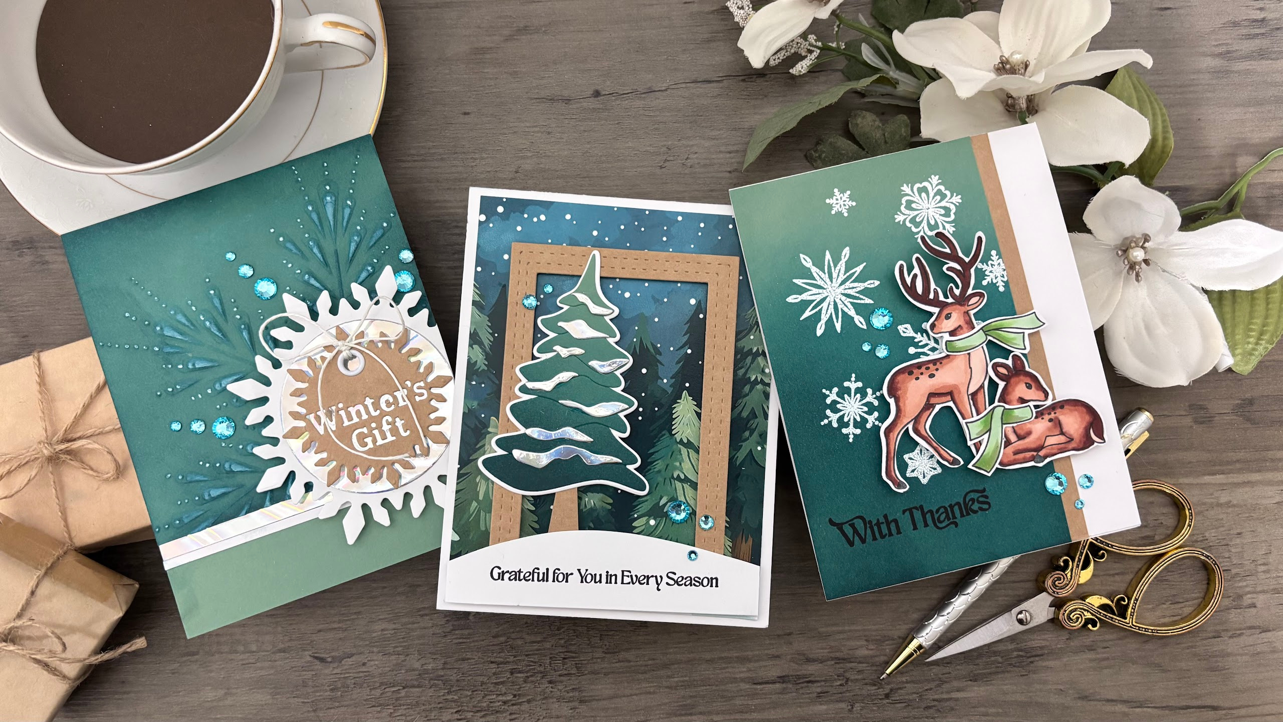 I had so much fun creating these three snow-filled cards using the gorgeous Sage, Holographic, and Metallic Kraft cardstocks included in the kit (pro tip: the opposite side has that stunning silver metallic!). Every single supply was used, right down to the adorable patterned papers from the Simon Say Stamp Card Kit. I am thrilled with how they turned out and hope you love them, too!