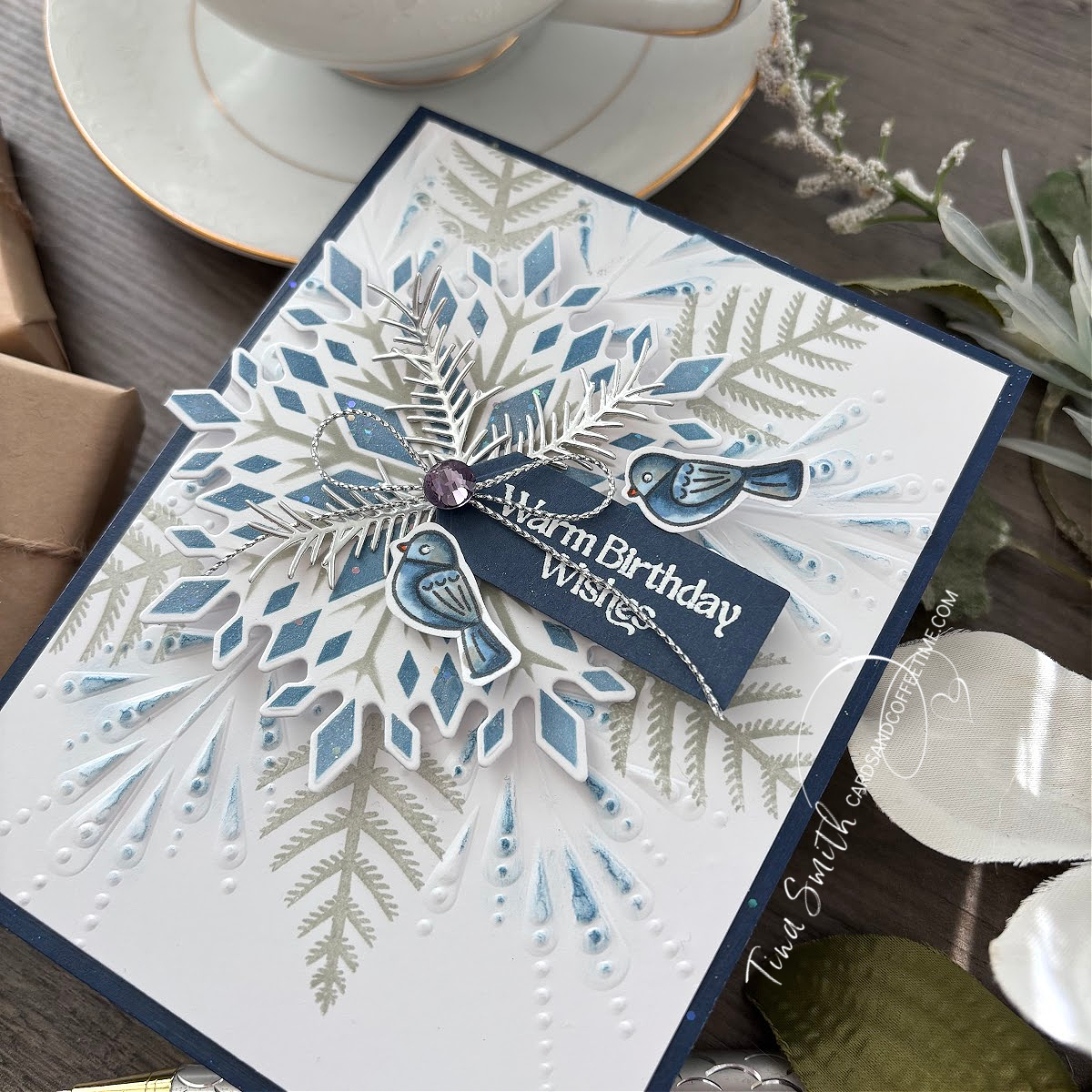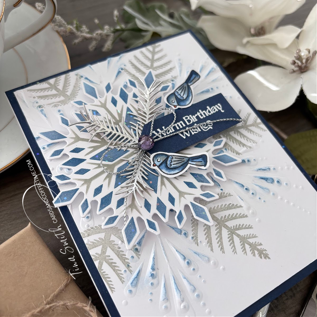 I whipped up this multi-layered Winter birthday card. I did a cool two-toned embossed and stenciled snowflake situation. I love a little plot twist in my crafting, so I actually repurposed one of the trees from the stamp set to sneak a second color onto the snowflake. Rebellious, I know. Obsessed with how my little rule-breaking turned out!