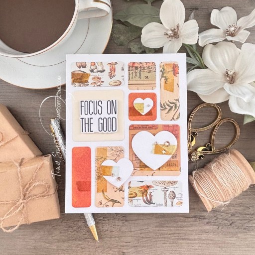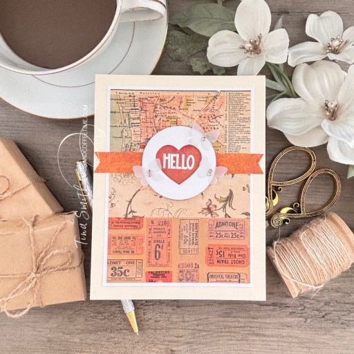 One of the Tim Holtz Idea-ology Currated Palette Collection patterned papers were used for this card. Placing a white mat behind it to brighten it up. I die cut a white heart window and placed a heat embossed greeting behind it. Adding a coordinating thin banner across the front. Vellum butterflies gives this card a dainty touch.