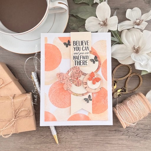 The Be Your Beautiful Stamp set was used to create a bokeh effect on the background. The butterfly and circle dies were die cut with patterned paper and placed on a thin vertical banner making this a whimsicle focal point. Adding Popping up a greeting and adding gold gems finish this card beautifully.