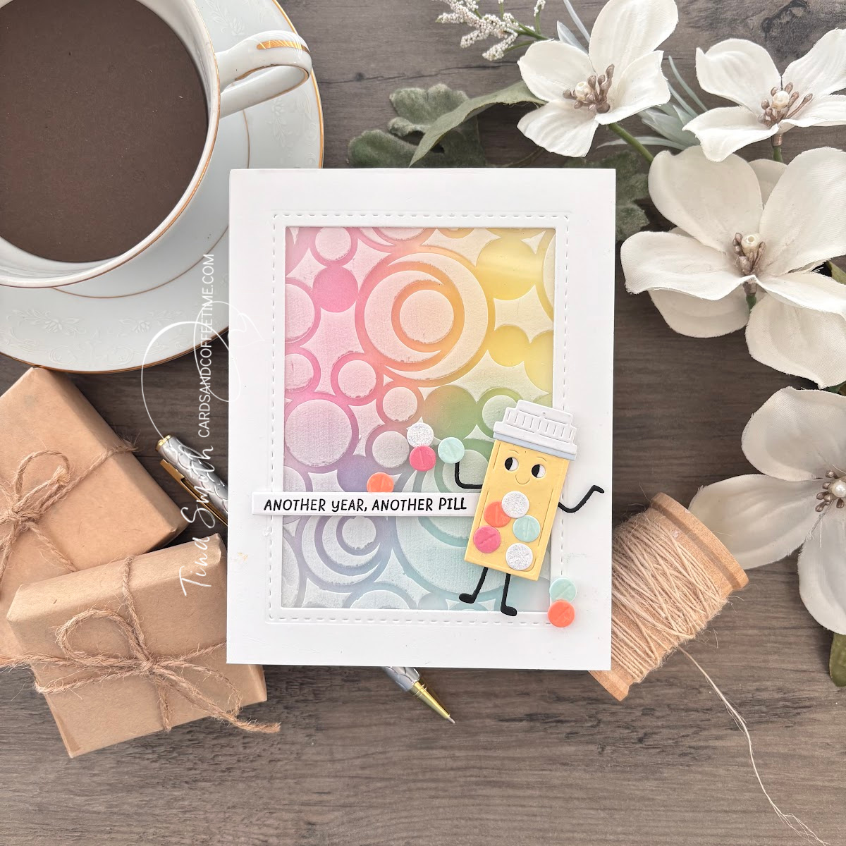 Hello cardmaking friends! I am back with another card using using the Spellbinders This is Life Collection, which is so much fun to work with. I’m making a handmade card with actual “happy pills,” because who couldn’t use a little legal mood boost? I’m using the Favorite Side Effect Stamp and Die set, which is full of hilarious greetings. I chose “Another Year, Another Pill” because it’s basically my new life motto.