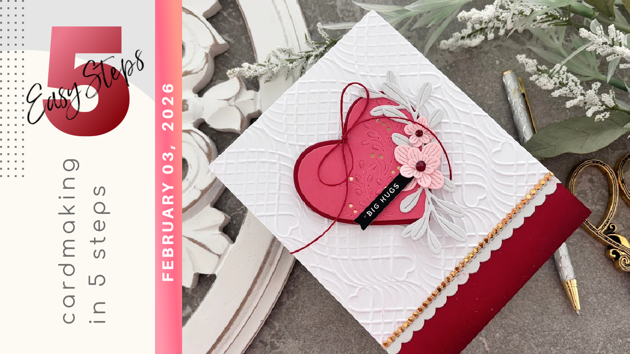 Hello creative friends! I’m sharing a “Big Hugs” card in only five steps. We are going all-in with Valentine’s Day colors with this project using a few shades of pinks and some bold red.