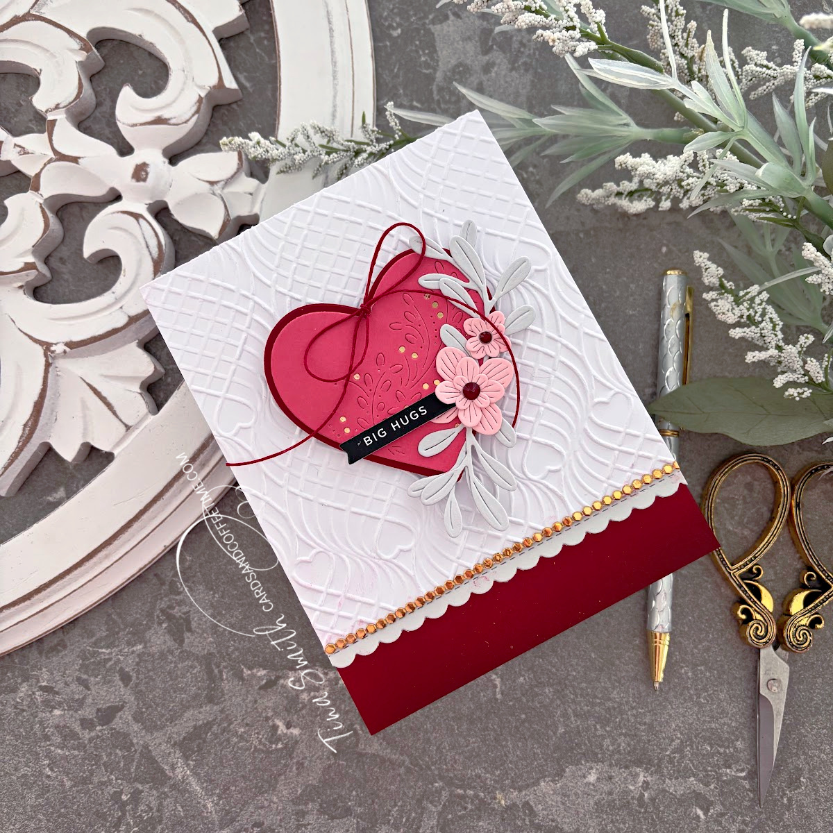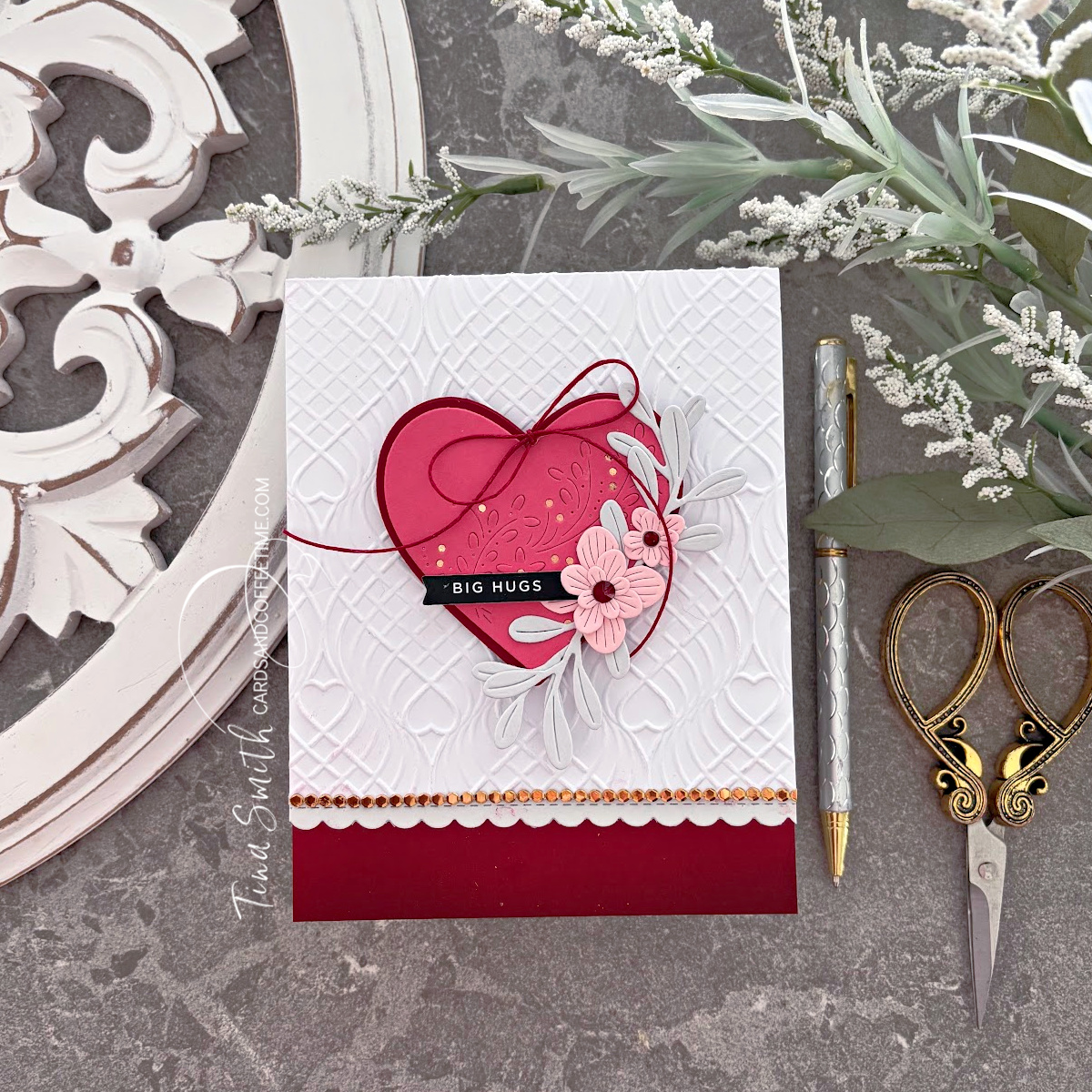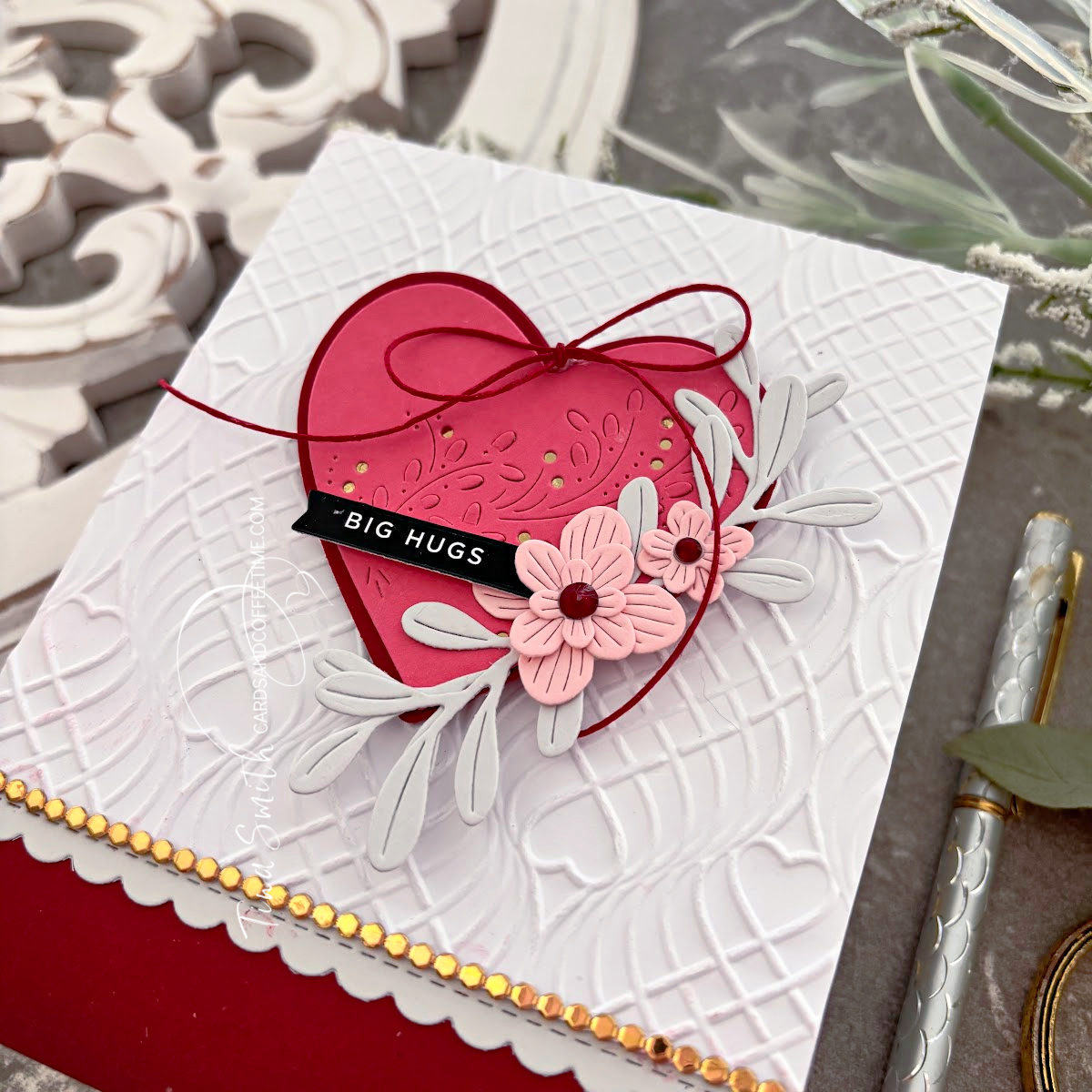 I’m featuring the Flourish Heart Die Set as the main event. I also used the super pretty Wirework Hearts 3D Embossing Folder, both are from the Simon Says Stamp Heart to Heart Release. I love the classic look of this and you won’t believe how easy this is to put together. Let’s jump into the tutorial!