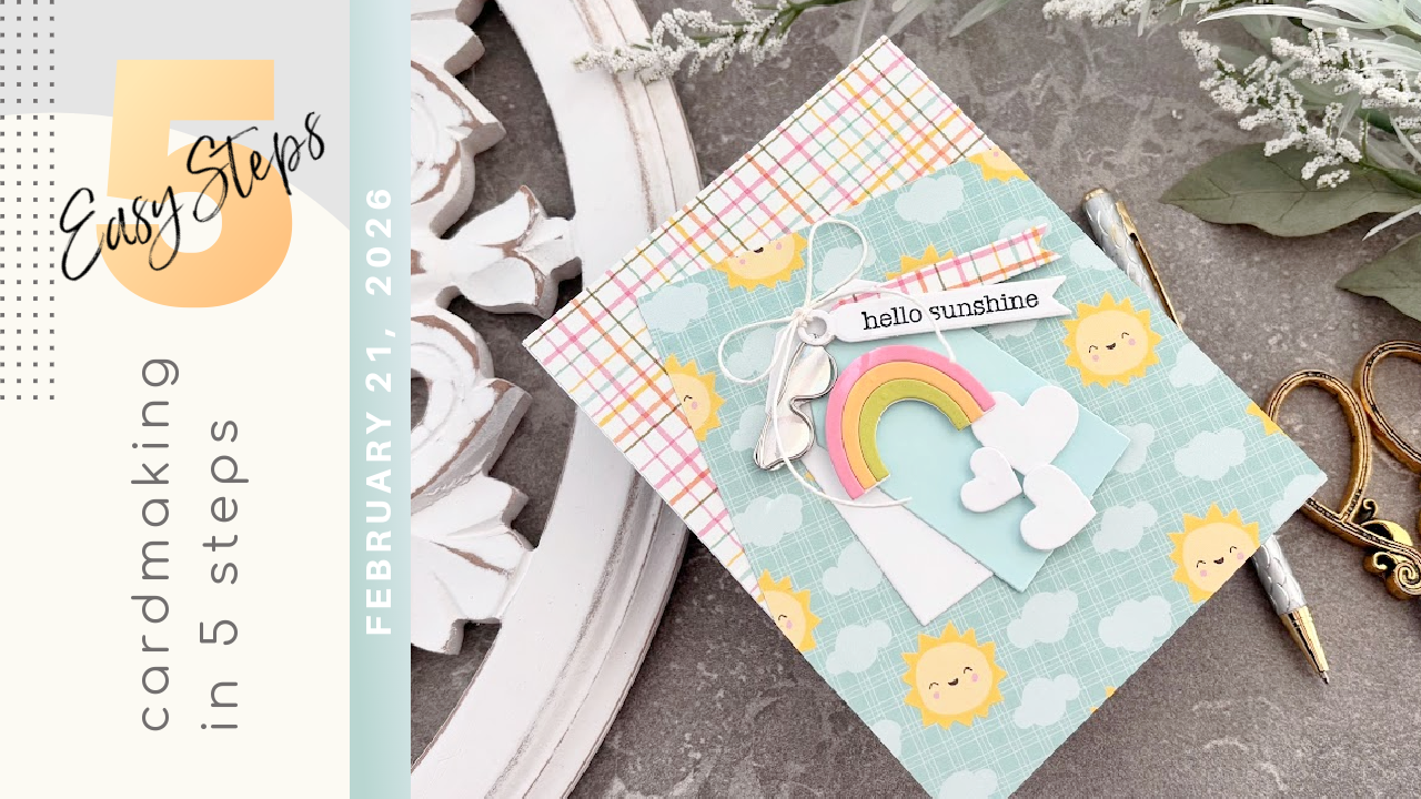 We’re channeling pure sunshine today by raiding the set for its rainbow and hearts to build a cheerful masterpiece. I’m even dusting off some fancy trinkets and patterned papers that have been hibernating in my “save for later” pile way too long. Enjoy this Easy 5 Step card!